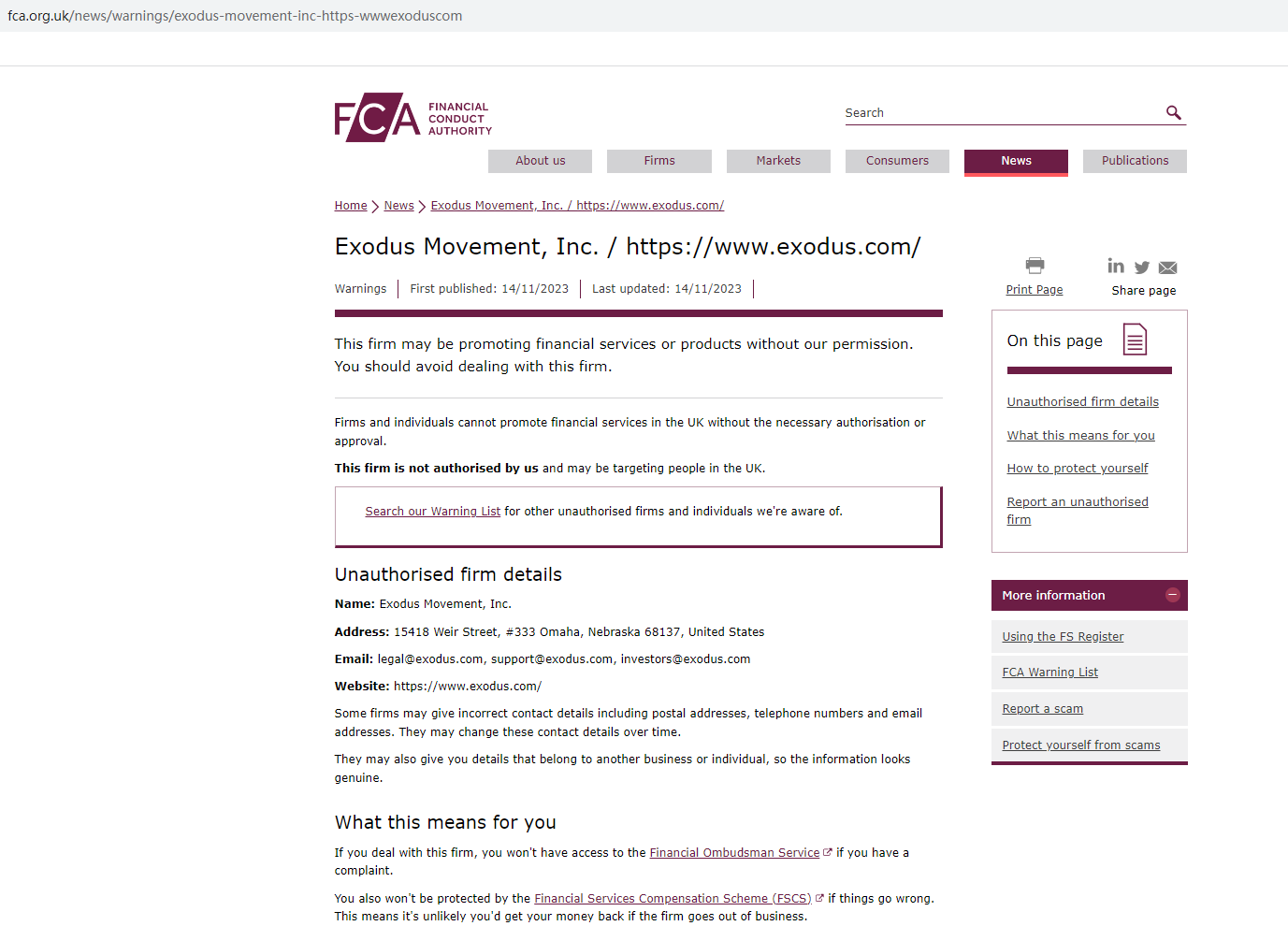 On 14 November 2023, the United Kingdom Financial Conduct Authority (UK FCA) issued a warning that Exodus Movement, Inc was providing financial services or products in the UK without authorisation. You may visit: https://www.fca.org.uk/news/warnings/exodus-movement-inc-https-wwwexoduscom