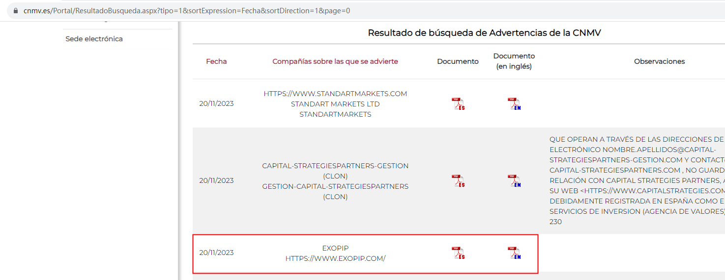 On 20 November 2023, the Comisión Nacional del Mercado de Valores (CNMV) issued a warning that Exopip was providing financial services or products without authorisation. You may visit: https://www.cnmv.es/Portal/ResultadoBusqueda.aspx?tipo=1&sortExpression=Fecha&sortDirection=1&page=0
