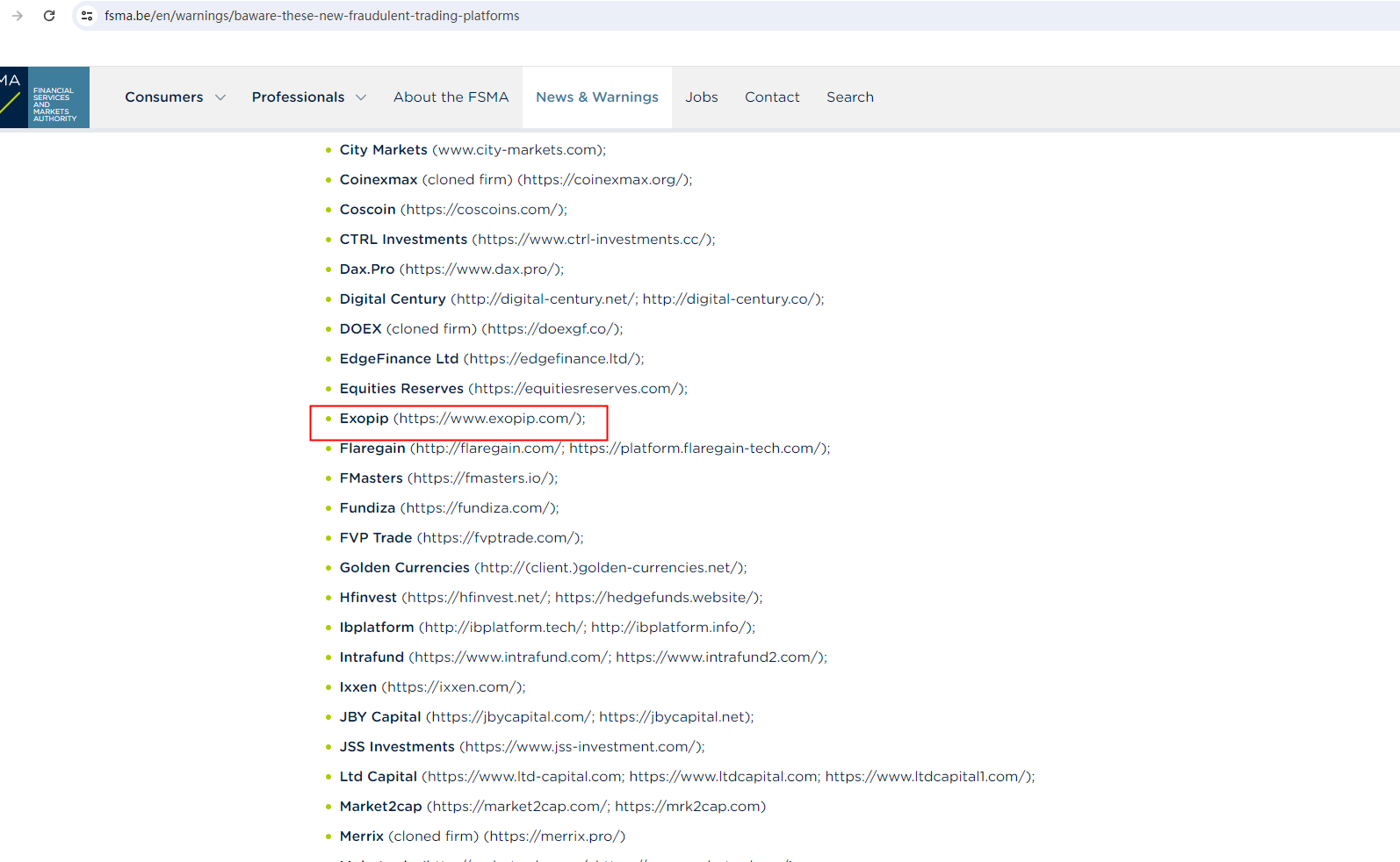 On March 14, 2024, the Belgian Financial Services and Markets Authority (FSMA) added Exopip to its warning list as a fraudulent trading platform. https://www.fsma.be/en/warnings/baware-these-new-fraudulent-trading-platforms