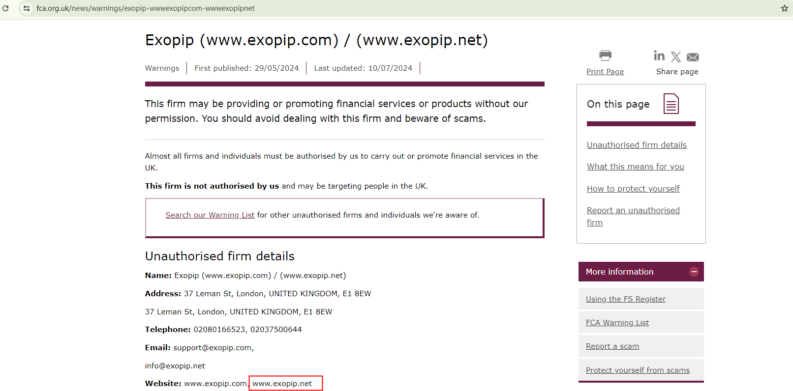 The Financial Conduct Authority (FCA) adds a new domain for Exopip, exopip.net, to its warning about the scam. https://www.fca.org.uk/news/warnings/exopip-wwwexopipcom-wwwexopipnet