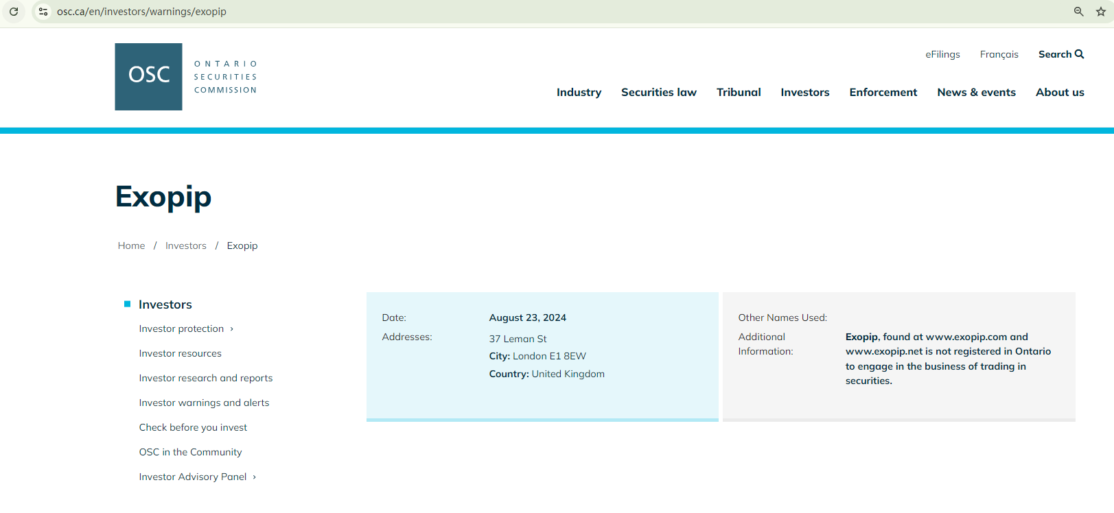 On August 23, 2024, the Ontario Securities Commission (OSC) issued a warning against Exopip, stating that this broker is not registered in Ontario to engage in the business of trading in securities. https://www.osc.ca/en/investors/warnings/exopip