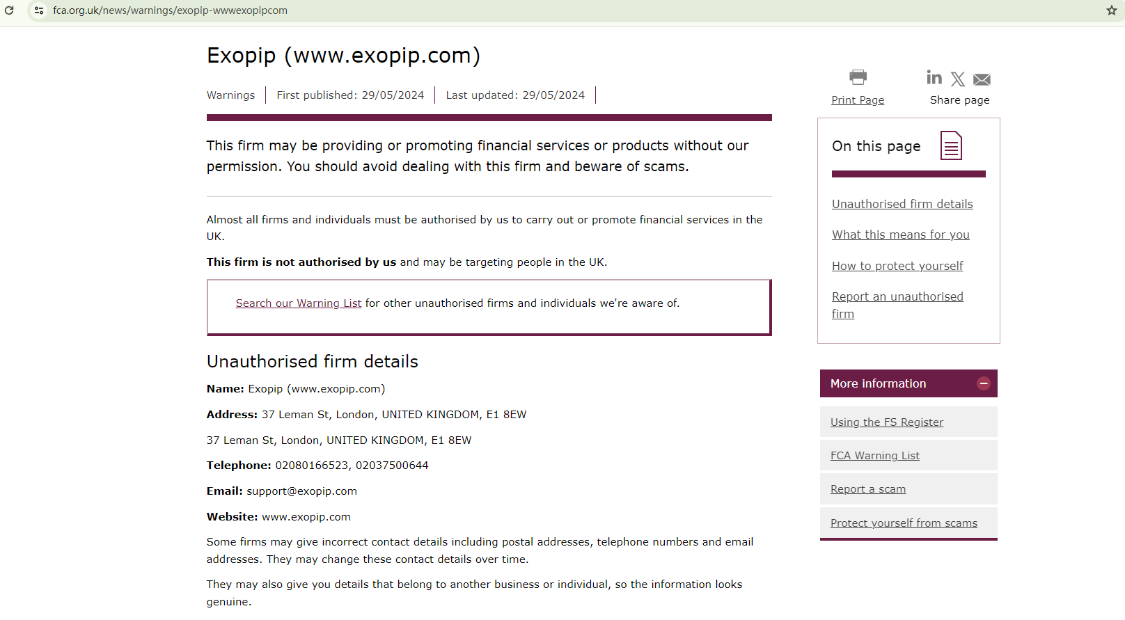 On May 29, 2024, the Financial Conduct Authority (FCA) issued a warning against Exopip, believing this company might be providing financial services or products without proper authorization in the UK. https://www.fca.org.uk/news/warnings/exopip-wwwexopipcom