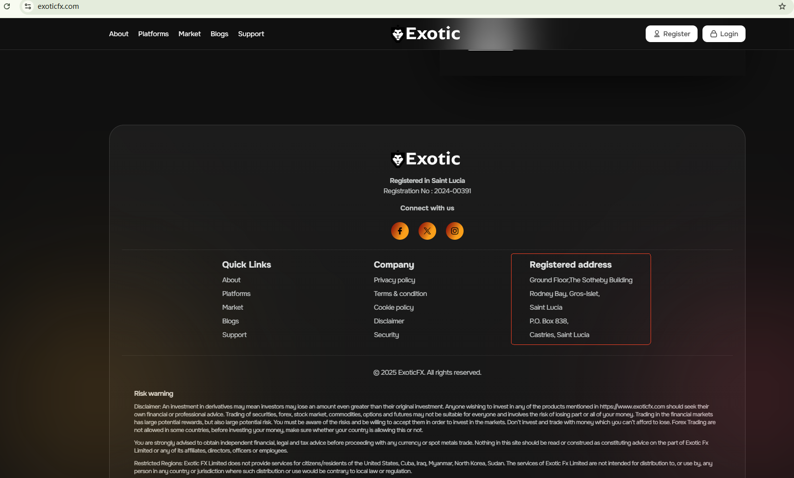 Exotic FX, despite claiming to provide services for forex trading, is not properly licensed. It only relies on an alleged registration in St. Lucia to substantiate its legitimacy and compliance with the industry rules. However, the registration it puports to have cannot constitute a license from a financial regulator. In addition, St. Lucia has clearly stated that forex trading activities are not licensed in the country.