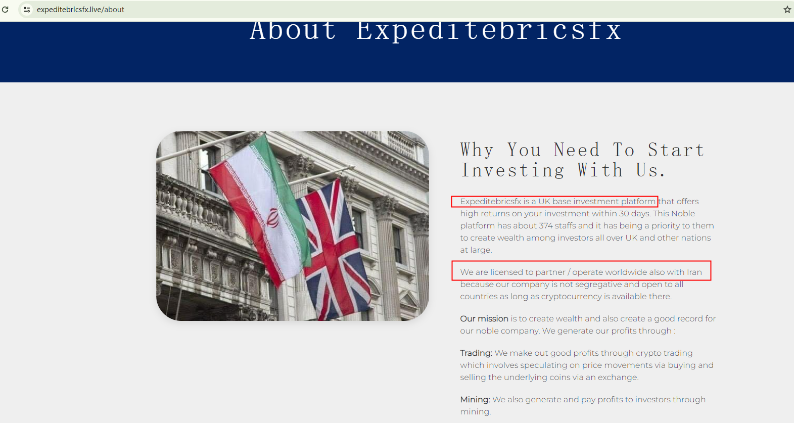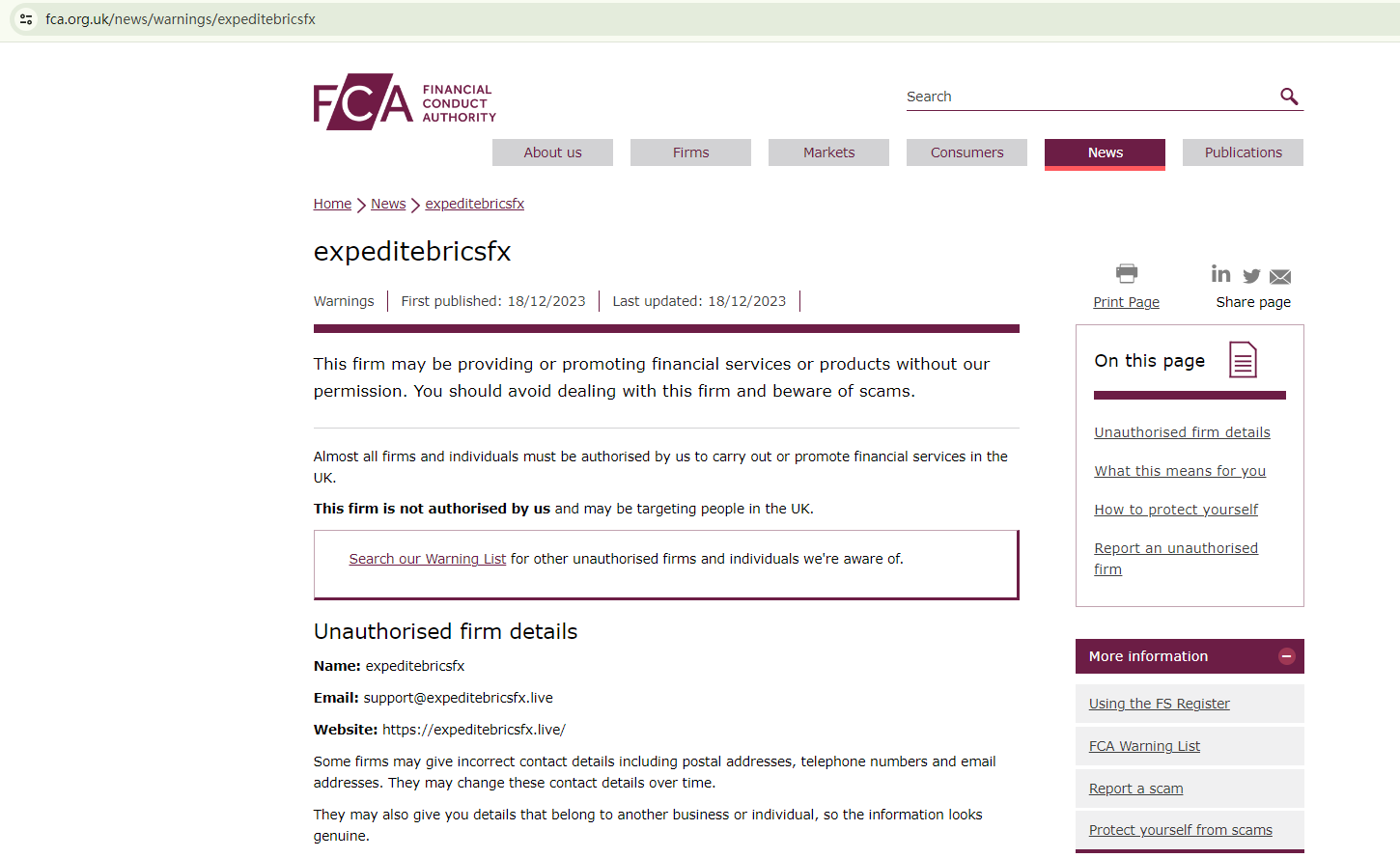 Expeditebricsfx claims to be based in the UK. However, the Financial Conduct Authority (FCA), the British financial watchdog, has issued a warning against this trading platform, identifying it as an unauthorized firm.