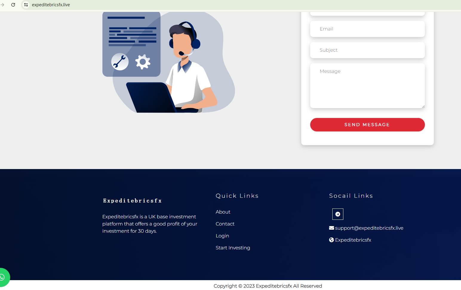 In addition to the absence of the necessary licenses, Expeditebricsfx presents several telltale signs of an investment scam. These include the promise of unusually high returns, the display of fake profit notifications, and unfounded glowing testimonials. The "Contact" link merely leads to a Telegram group, and the site lacks essential information about its operator, including an office address and phone number.