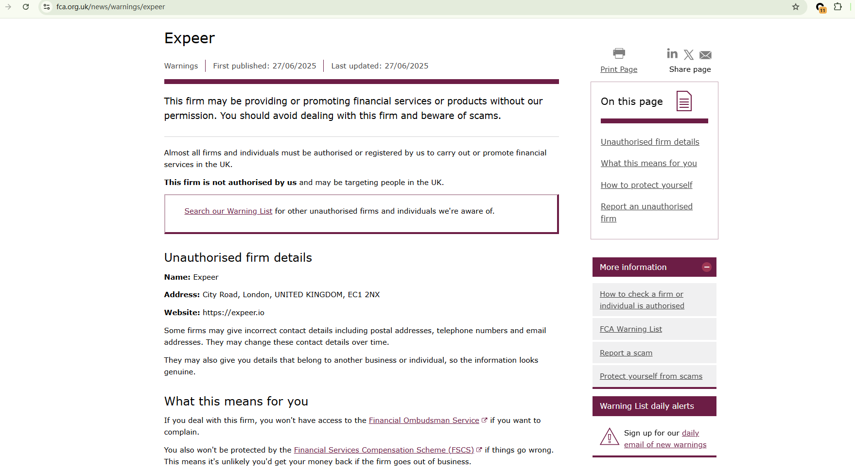 On Jun 27, 2025, the Financial Conduct Authority (FCA) issued a warning against Expeer, believing this company might be providing financial services or products without proper authorization in the UK. https://www.fca.org.uk/news/warnings/expeer