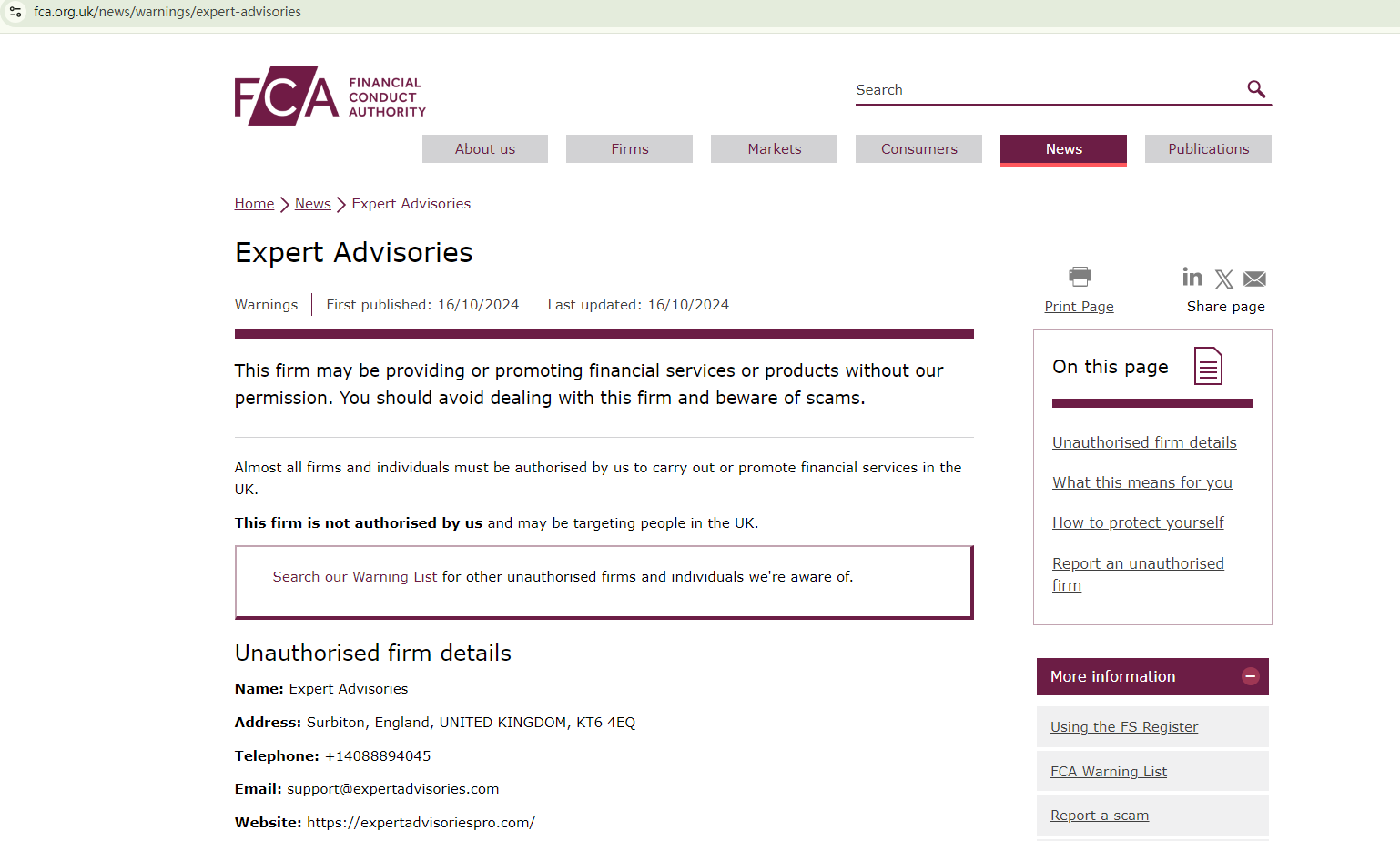 On October 16, 2024, the Financial Conduct Authority (FCA) issued a warning about Expert Advisories for operating without the required authorization. https://www.fca.org.uk/news/warnings/expert-advisories