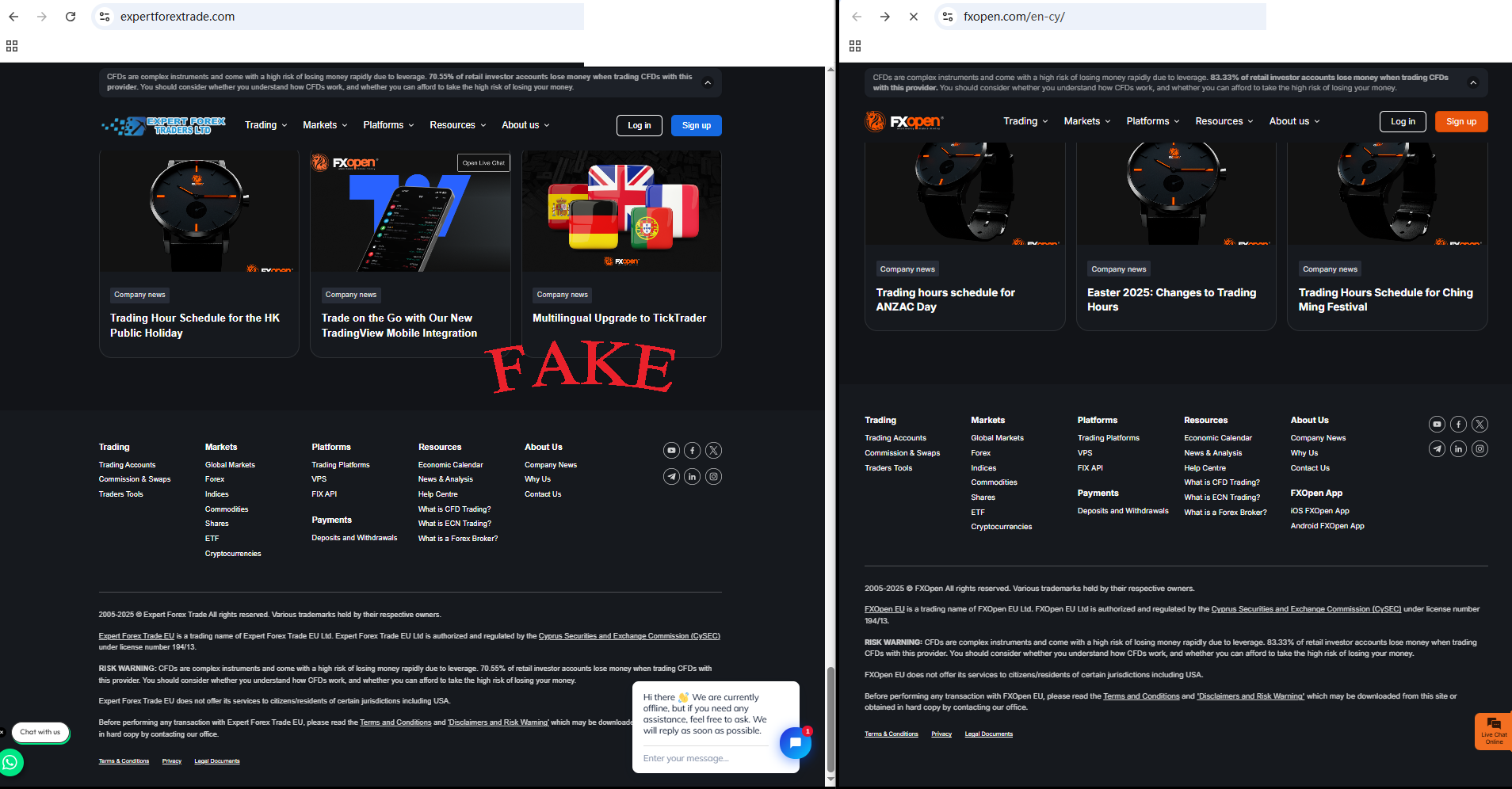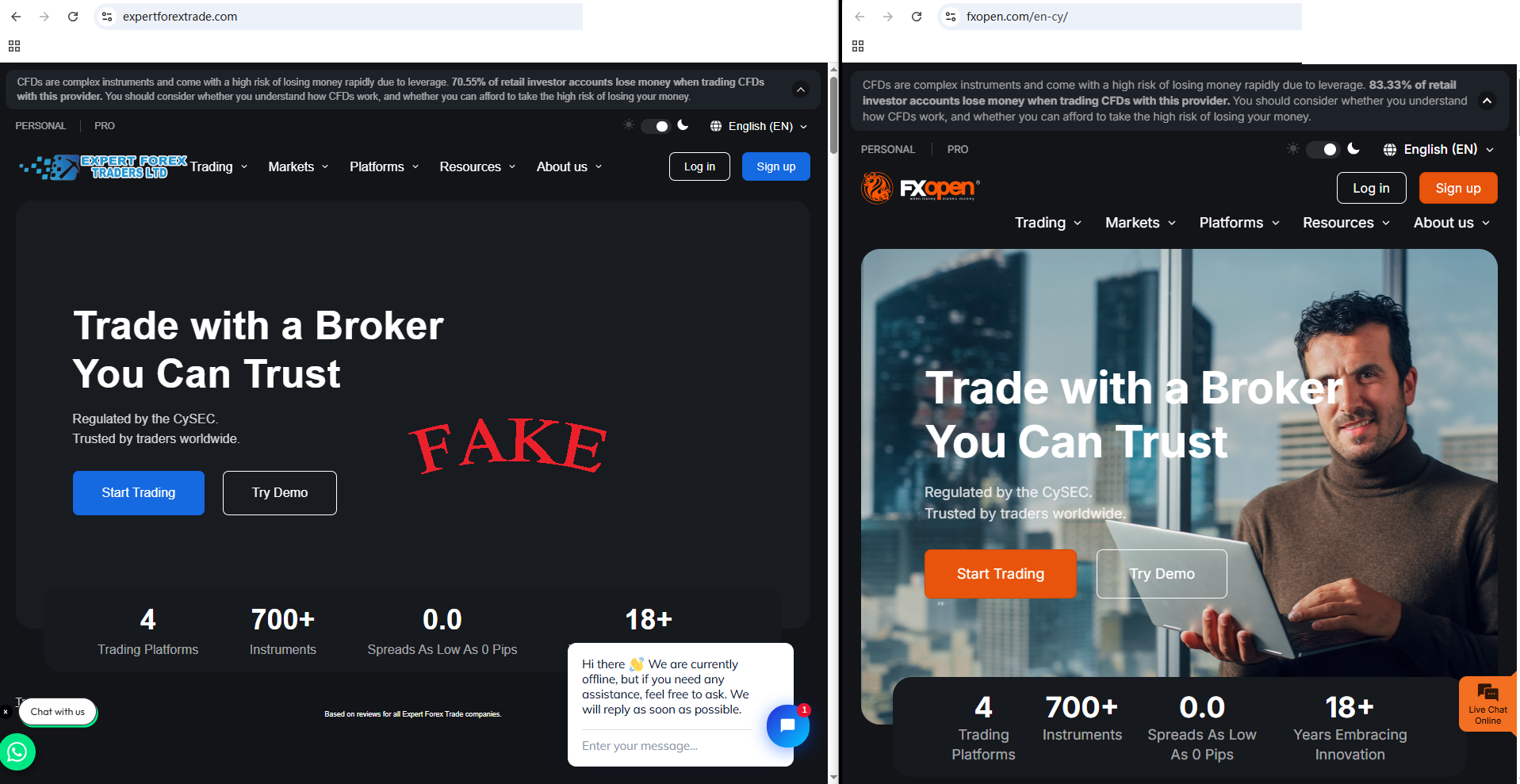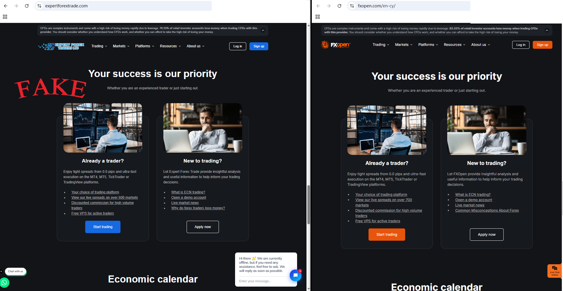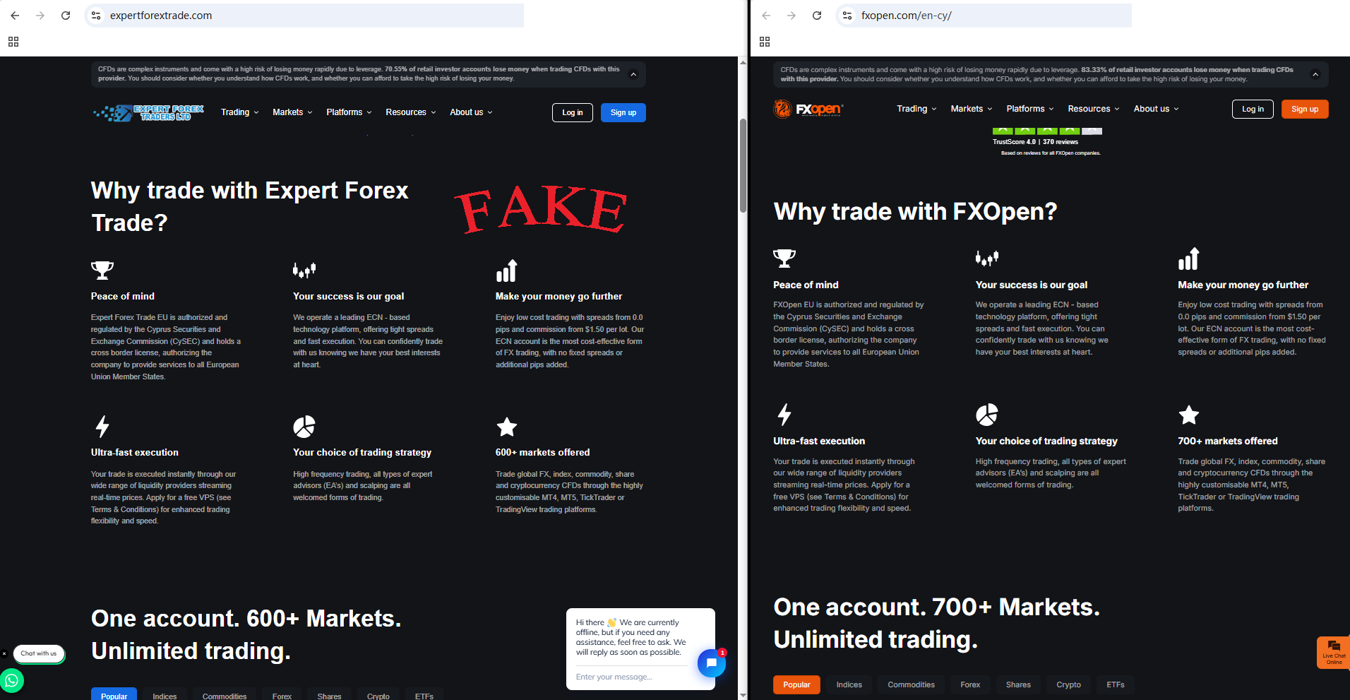 Based on the details of their website, we compared the website pages of expertforextrade.com and FXOPEN EU Ltd and found that they are very similar. expertforextrade.com copied the content and graphic design of FXOPEN EU Ltd, which means that the website misuses the information of legitimate brokers to make it look real or give the feeling of any potential connection with the licensee. Either way, this is a clear sign of a scam.