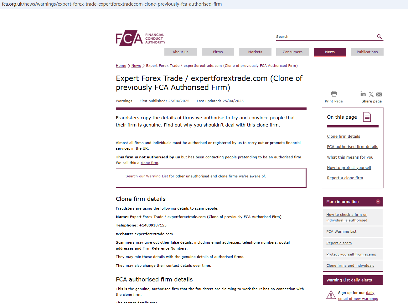 On April 25, 2025, the Financial Conduct Authority (FCA) issued a warning against expertforextrade.com, identifying this company as a clone of an FCA-authorized firm. https://www.fca.org.uk/news/warnings/expert-forex-trade-expertforextradecom-clone-previously-fca-authorised-firm