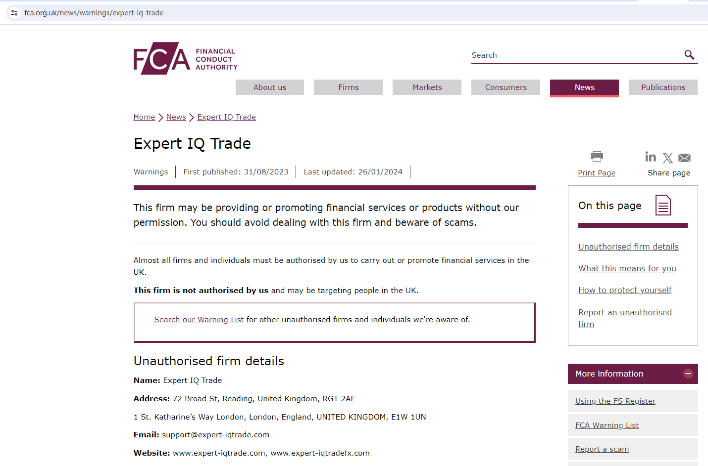 On 31 August 2023, the United Kingdom Financial Conduct Authority (UK FCA) issued a warning that Expert IQ Trade was providing financial services or products in the UK without authorisation. You may visit: https://www.fca.org.uk/news/warnings/expert-iq-trade