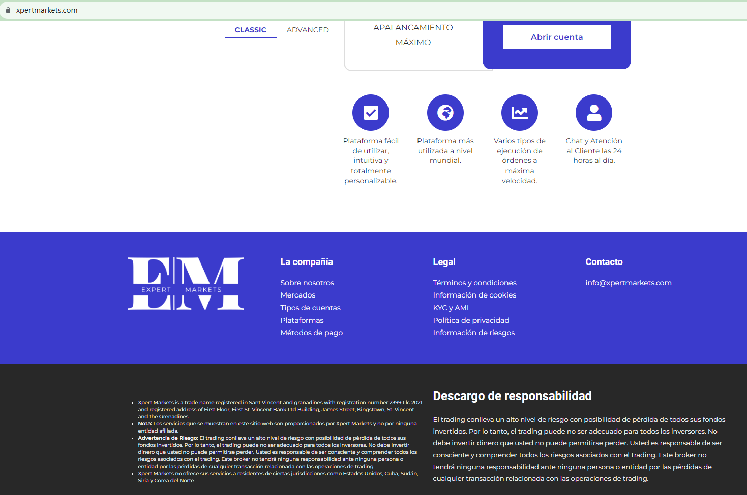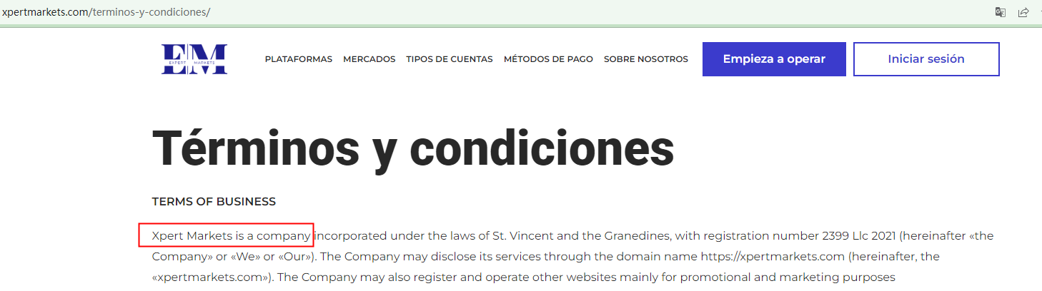 EXPERT MARKETS (XPERT MARKETS) vaguely claims to be a trading name registered with the Financial Services Authority of St. Vincent and the Grenadines (SVG FSA) under registration number 2399 (In its Terms and Conditions, it refers to itself as a company named Xpert Markets).