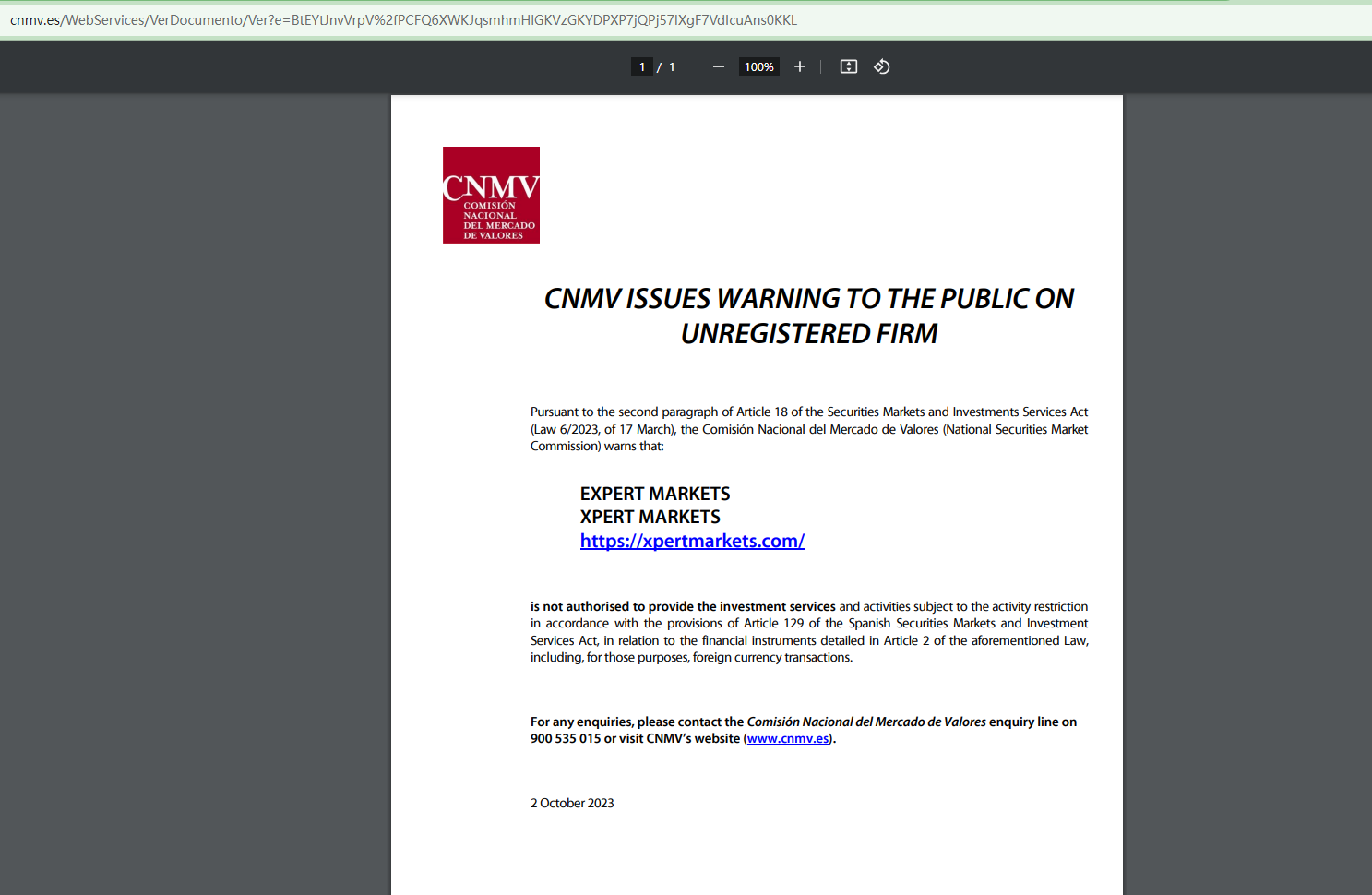 On October 2, 2023, the Comisión Nacional del Mercado de Valores (CNMV) added EXPERT MARKETS (XPERT MARKETS) to its warning list for providing investment services without authorization. https://www.cnmv.es/Portal/ResultadoBusqueda.aspx?tipo=1&sortExpression=Fecha&sortDirection=1&page=0
