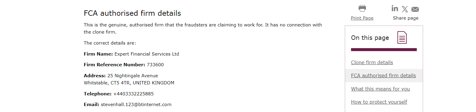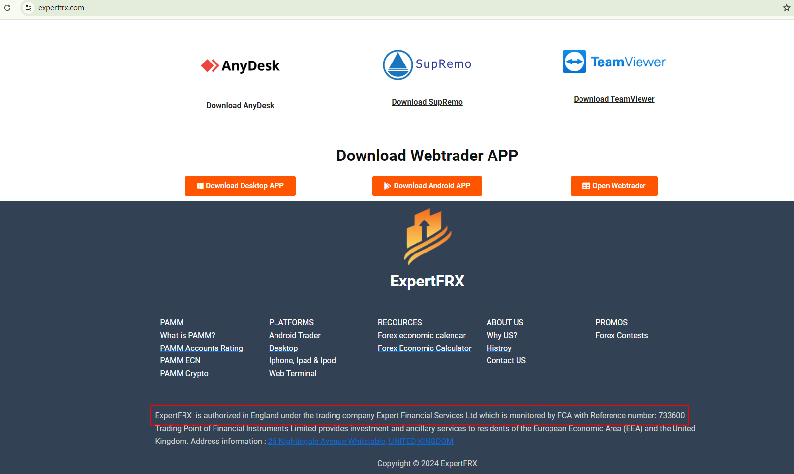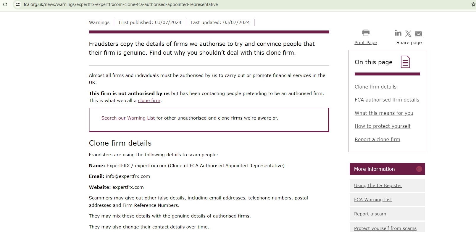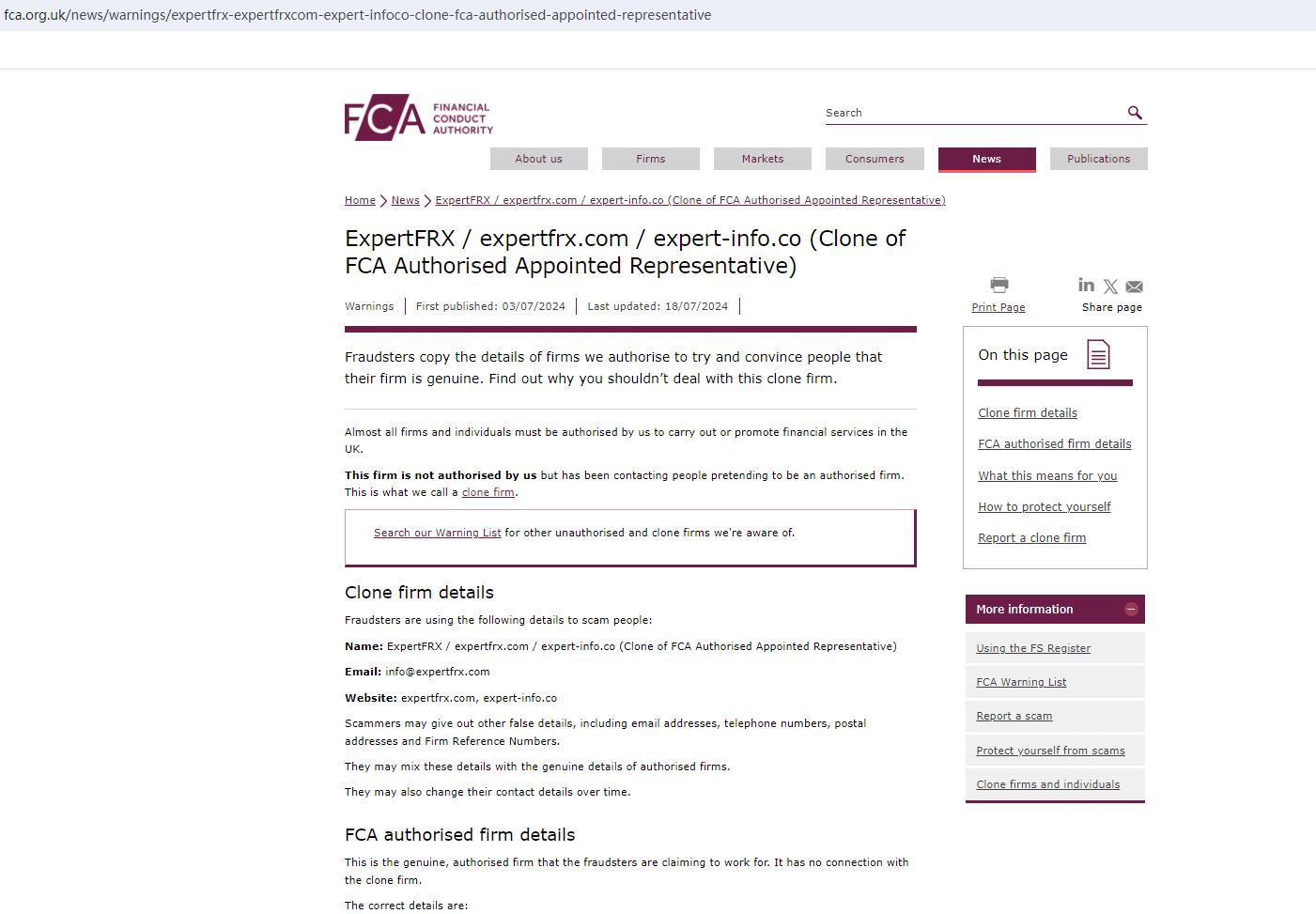 ExpertFRX unauthorizedly uses the FRN of a legitimate firm authorized by the Financial Conduct Authority (FCA) to deceive investors into believing they are real or create the false impression of having any association with the genuine one. This fraudulent practice resulted in a warning from the FCA, identifying it as a clone.