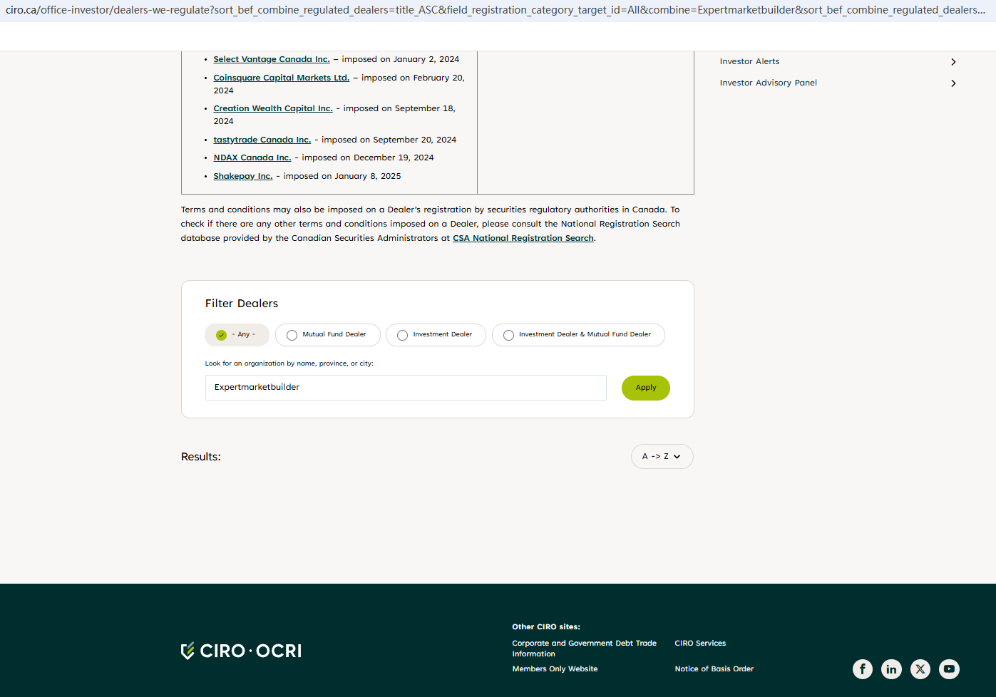 Based on the office addresses provided on their websites, we looked up the appropriate regulatory agencies. We did not find any matching information in the National Futures Association (NFA) and the Investment Industry Regulatory Organization of Canada (IIROC). In addition, the Financial Conduct Authority (FCA) issued a warning against Expertmarketbuilder, as it believed this company might be providing financial services or products without proper authorization in the UK.