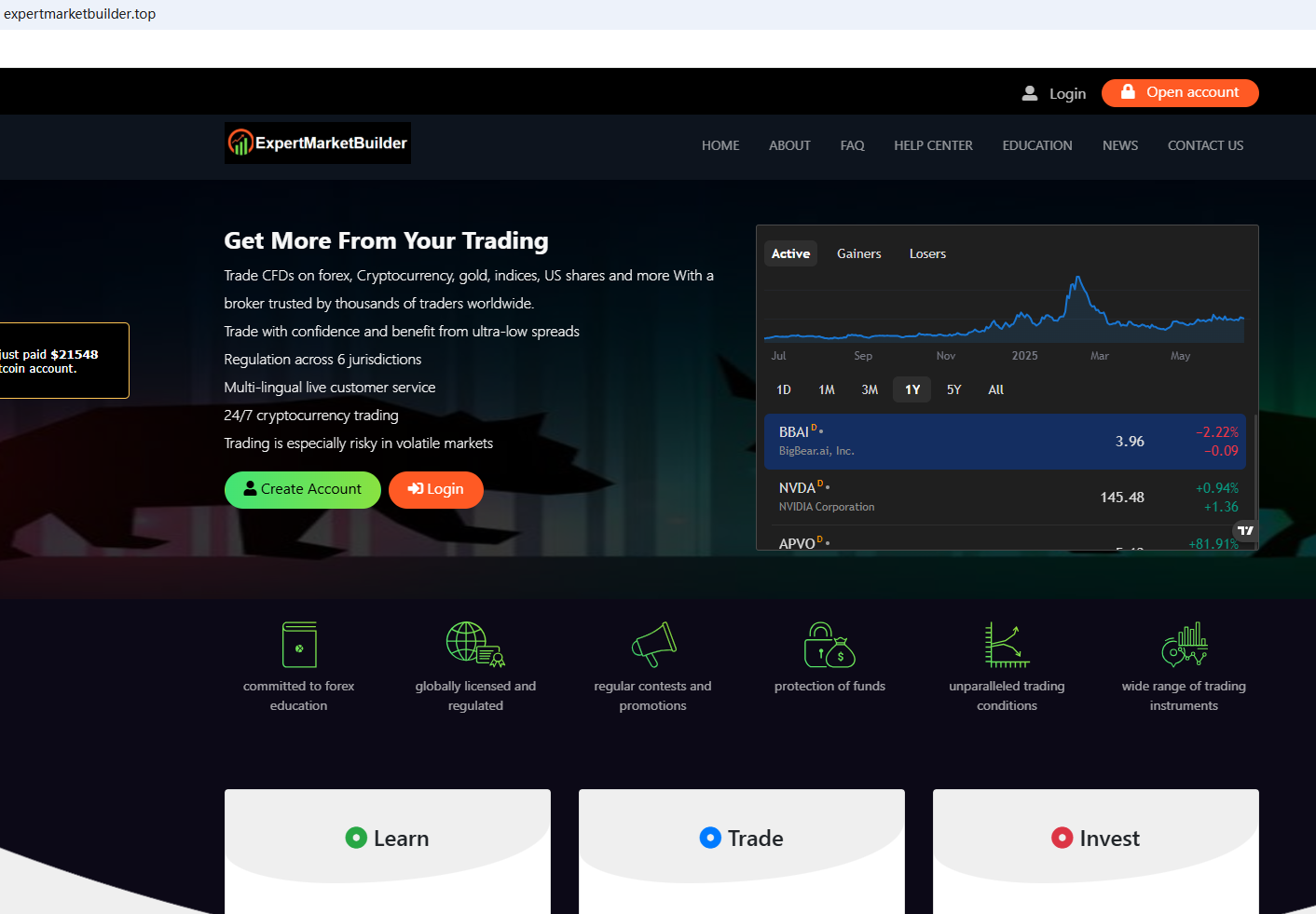 On Jun 16, 2025, the Financial Conduct Authority (FCA) issued a warning against Expertmarketbuilder, believing this company might be providing financial services or products without proper authorization in the UK. https://www.fca.org.uk/news/warnings/expertmarketbuilder