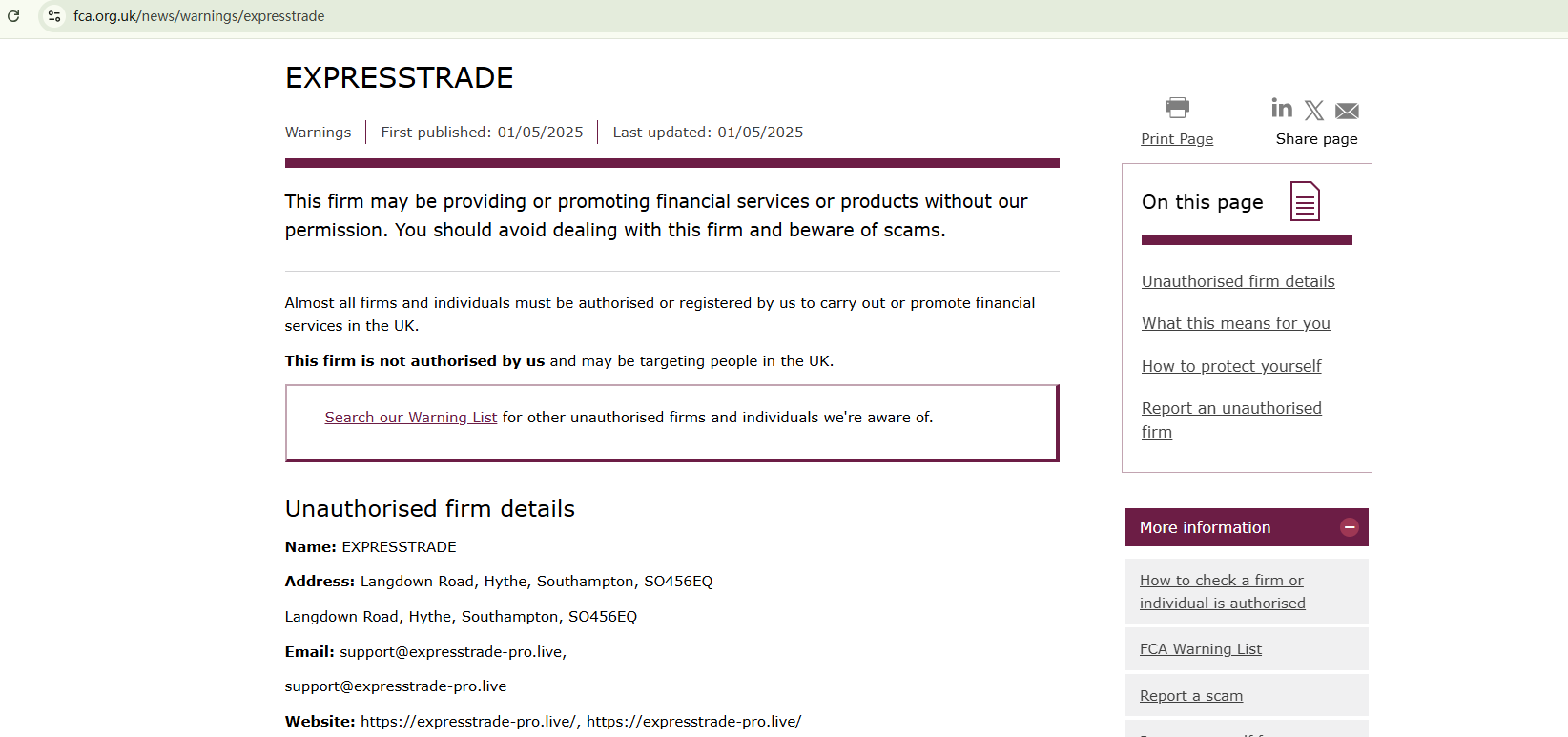 On May 1st, 2025, the Financial Conduct Authority (FCA) issued a warning against EXPRESSTRADE for the lack of the required authorization. https://www.fca.org.uk/news/warnings/expresstrade