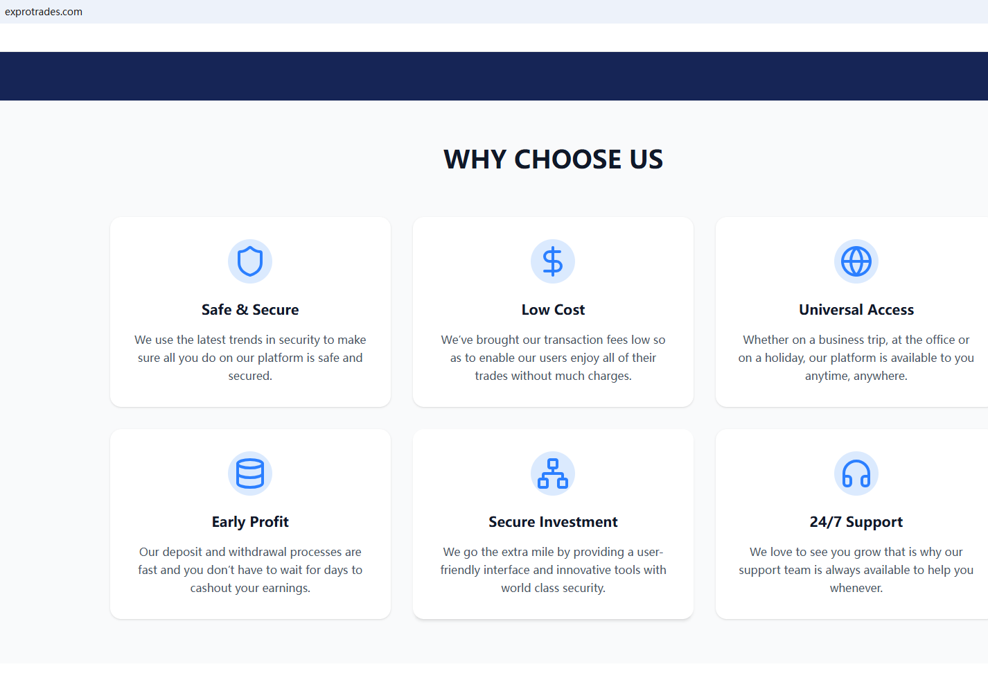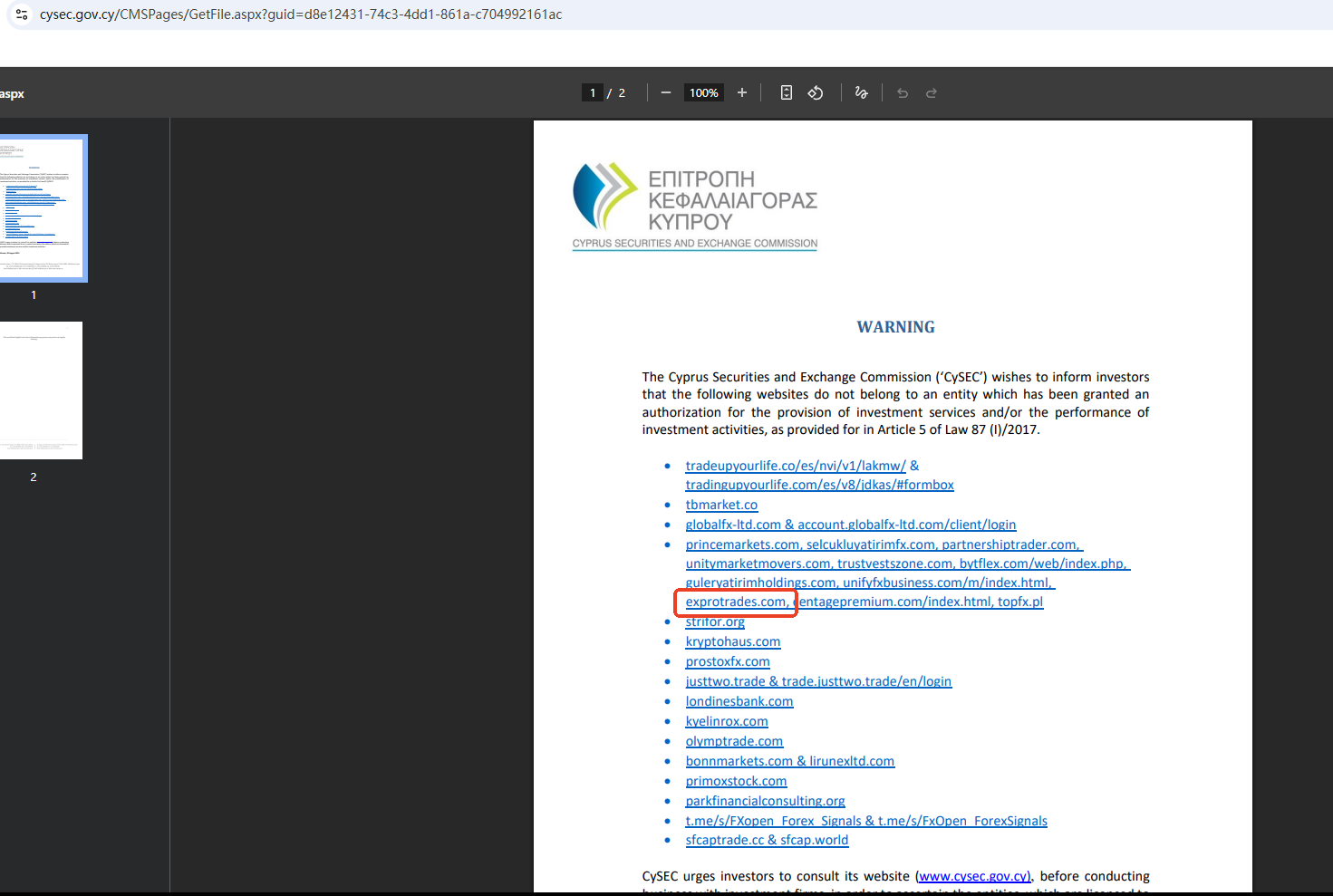 It claims on its website that the company was founded in 2018 and was incorporated in the United States. Upon investigation, we found that its domain name was only established in 2025, and it is obvious that what it said on the website is contrary to the facts. Secondly, no matching information was found in the National Futures Association (NFA). In addition, the Cyprus Securities and Exchange Commission (CySEC) issued a warning against Exprotrade, believing this company might be providing financial services or products without authorisation.