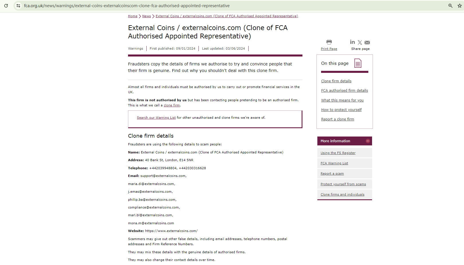 On June 3, 2024, the Financial Conduct Authority (FCA) issued a warning against External Coins, identifying it as a clone of an FCA-authorized firm. https://www.fca.org.uk/news/warnings/external-coins-externalcoinscom-clone-fca-authorised-appointed-representative