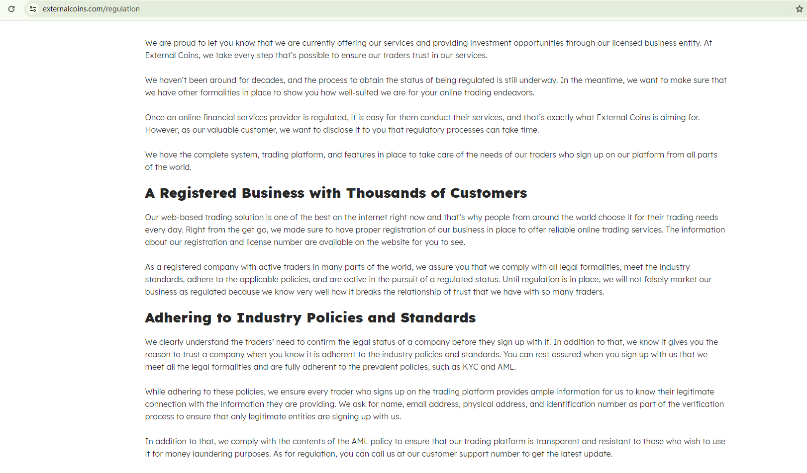 In essence, External Coins is not regulated by any governing body. Entrusting it with investors' funds is highly risky, as there are no legal protections in place to safeguard the funds.