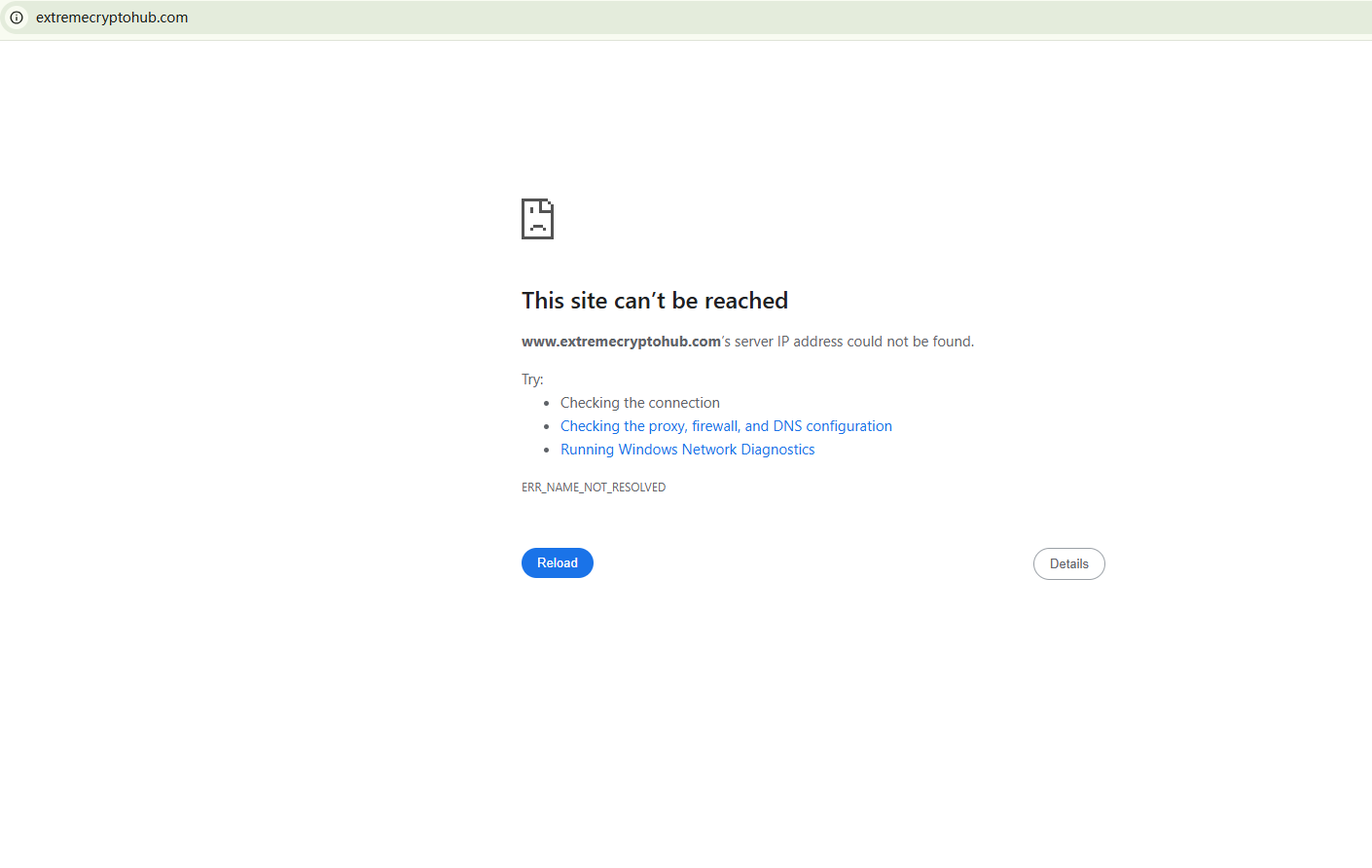 BrokersView found that the domain "https://www.extremecryptohub.com/" is currently inaccessible. This is widely regarded as a significant red flag, as the suspension of a broker's website often points to underlying regulatory or operational issues.