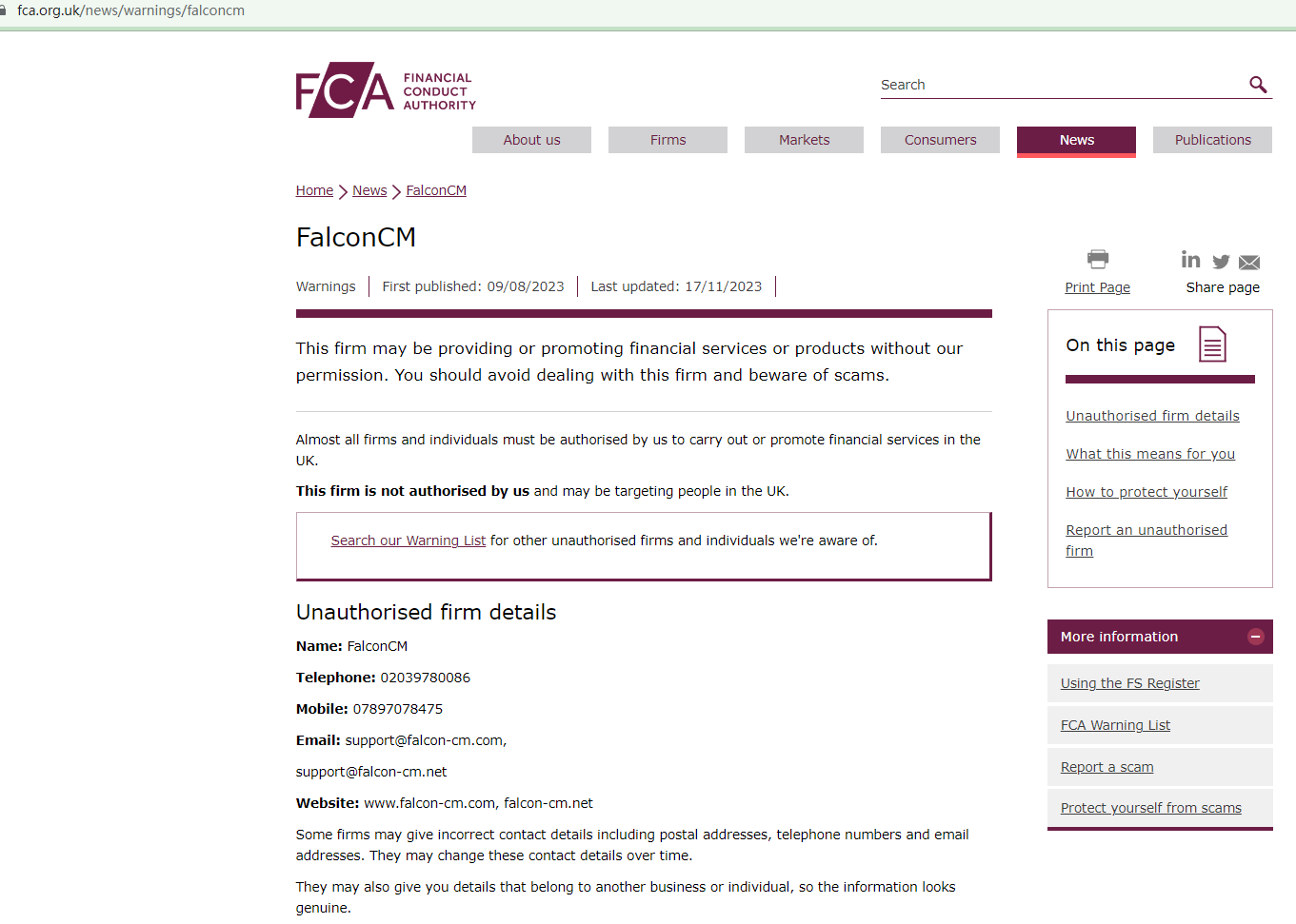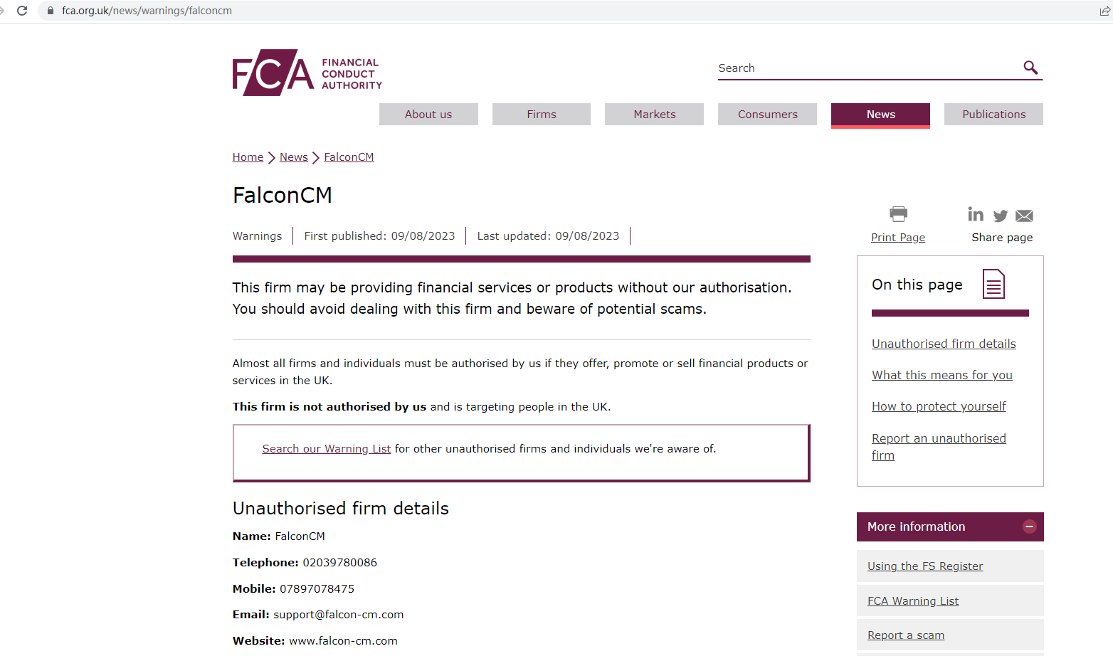 On August 9, 2023, the Financial Conduct Authority (FCA) issued its first warning against FalconCM and cautioned the public about the website www.falcon-cm.com.