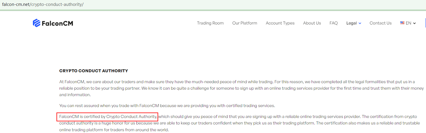 FalconCM presents itself as a legitimate trading platform licensed by the Crypto Conduct Authority (CCA).