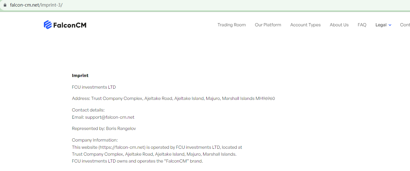 FalconCM claims to be operated by FCU Investments Ltd, a company registered with the Marshall Islands Registry (IRI). While this is true, mere registration with this privately held maritime and corporate registry service provider does not equate to being authorized to provide financial services or products legally.