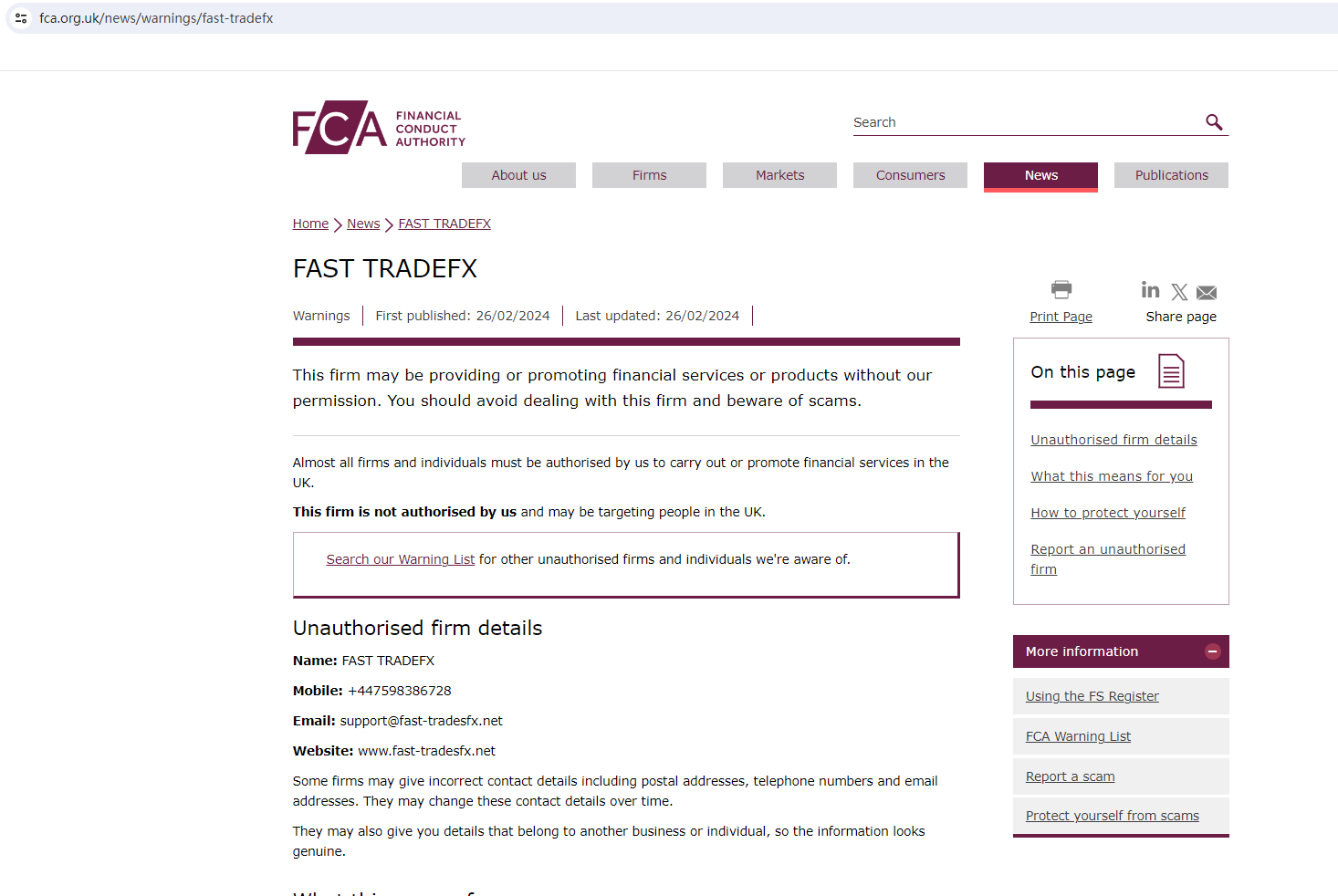 On 26 February 2024, the United Kingdom Financial Conduct Authority (UK FCA) issued a warning that FAST TRADESFX was providing financial services or products in the UK without authorisation. You may visit: https://www.fca.org.uk/news/warnings/fast-tradefx