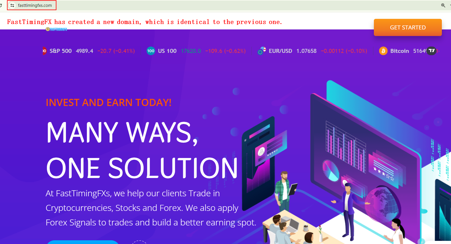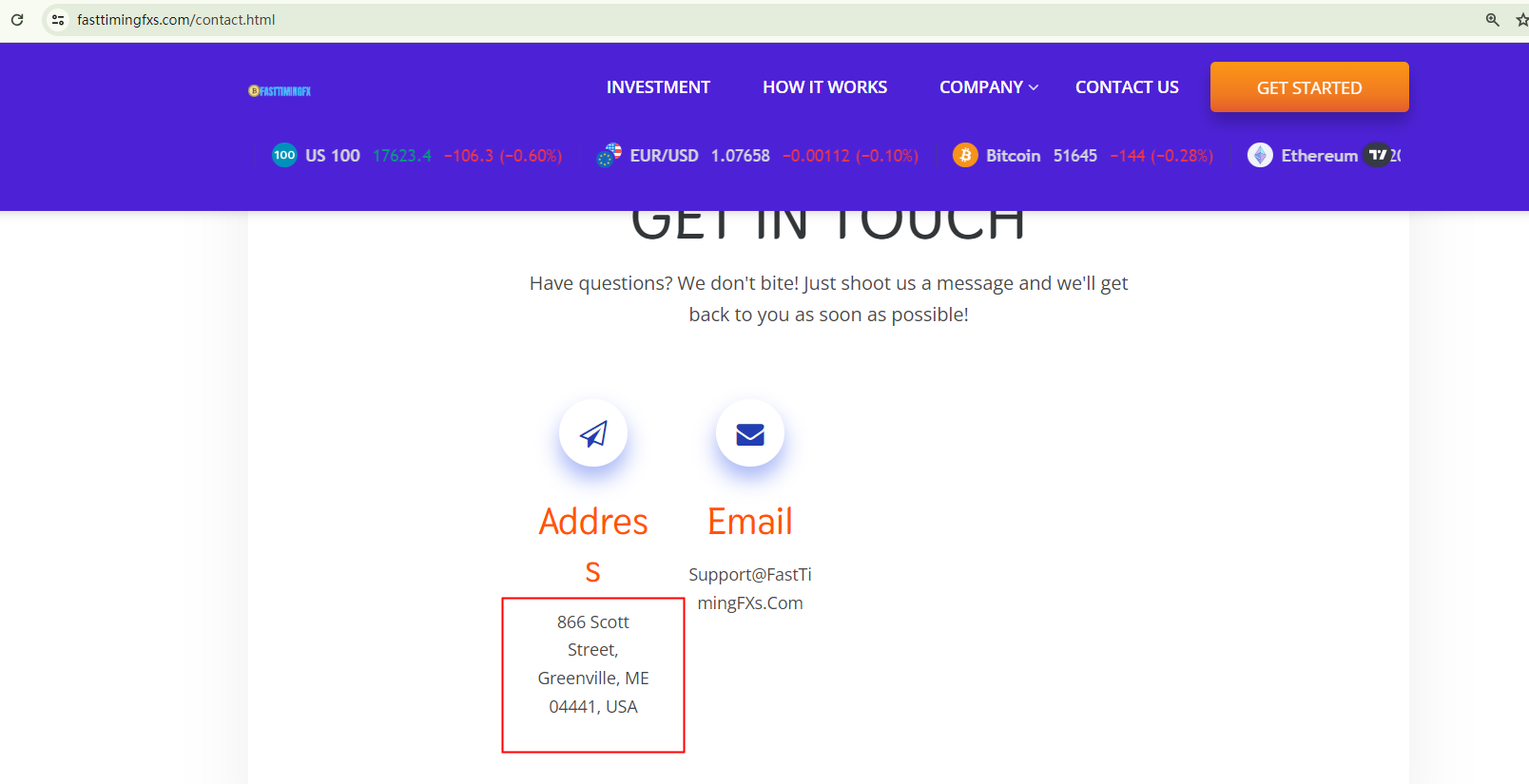 Following the Financial Conduct Authority's (FCA) warning, BrokersView has identified that the previous URL, https://www.fasttimingfx.com/, is no longer active. In its place, an identical website, https://fasttimingfxs.com/, has emerged under the same trading name, even sharing the same physical address in the USA. Investors are advised to exercise caution due to the inherent risks and steer clear of this scam.