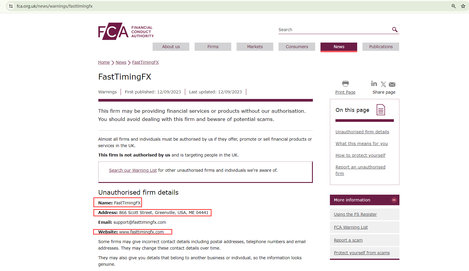 On 12 September 2023, the United Kingdom Financial Conduct Authority (UK FCA) issued a warning that FastTimingFX was providing financial services or products in the UK without authorisation. You may visit: https://www.fca.org.uk/news/warnings/fasttimingfx