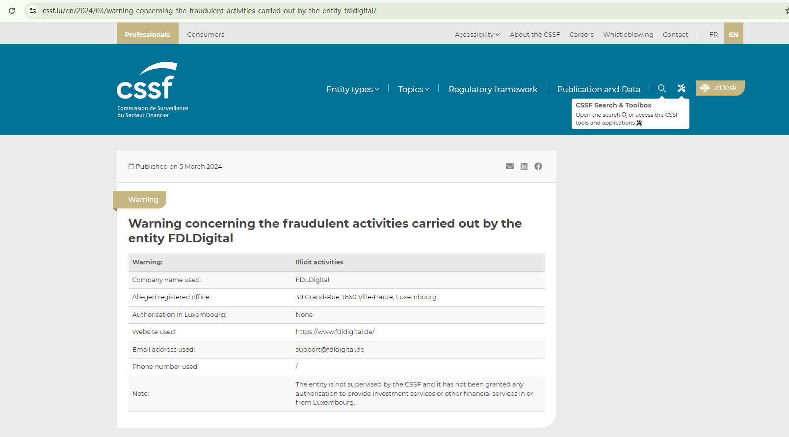 On March 5, 2024, Commission de Surveillance du Secteur Financier (CSSF) issues a warning about the fraudulent activities carried out by the entity FDLDigital. https://www.cssf.lu/en/2024/03/warning-concerning-the-fraudulent-activities-carried-out-by-the-entity-fdldigital/