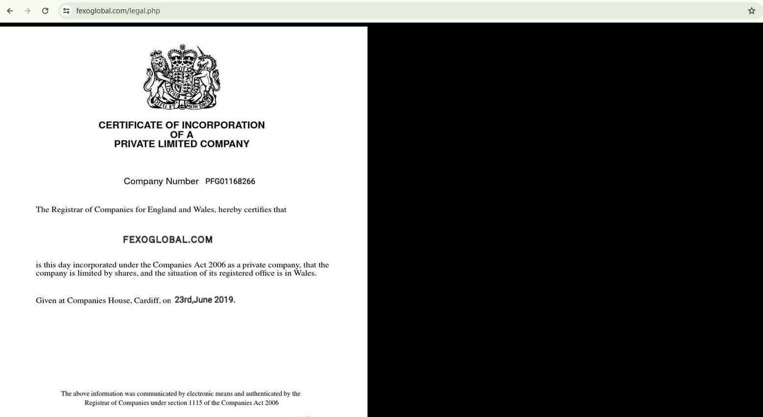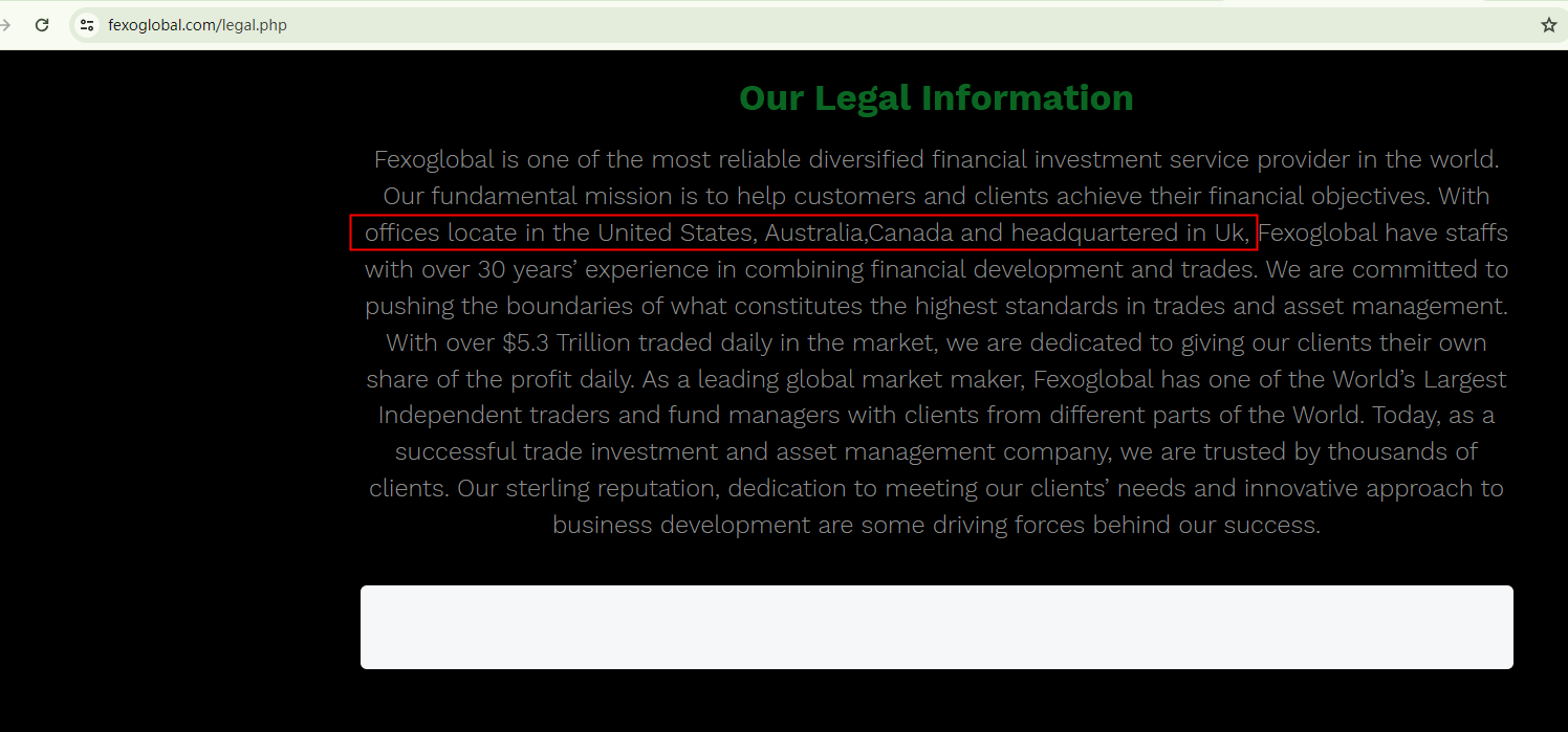 Fexoglobal presents identical regulatory information, including a counterfeit certificate from the Companies House (CH). Despite claiming to be headquartered in the UK, it has been identified as an unauthorized firm by the Financial Conduct Authority (FCA) in the UK.