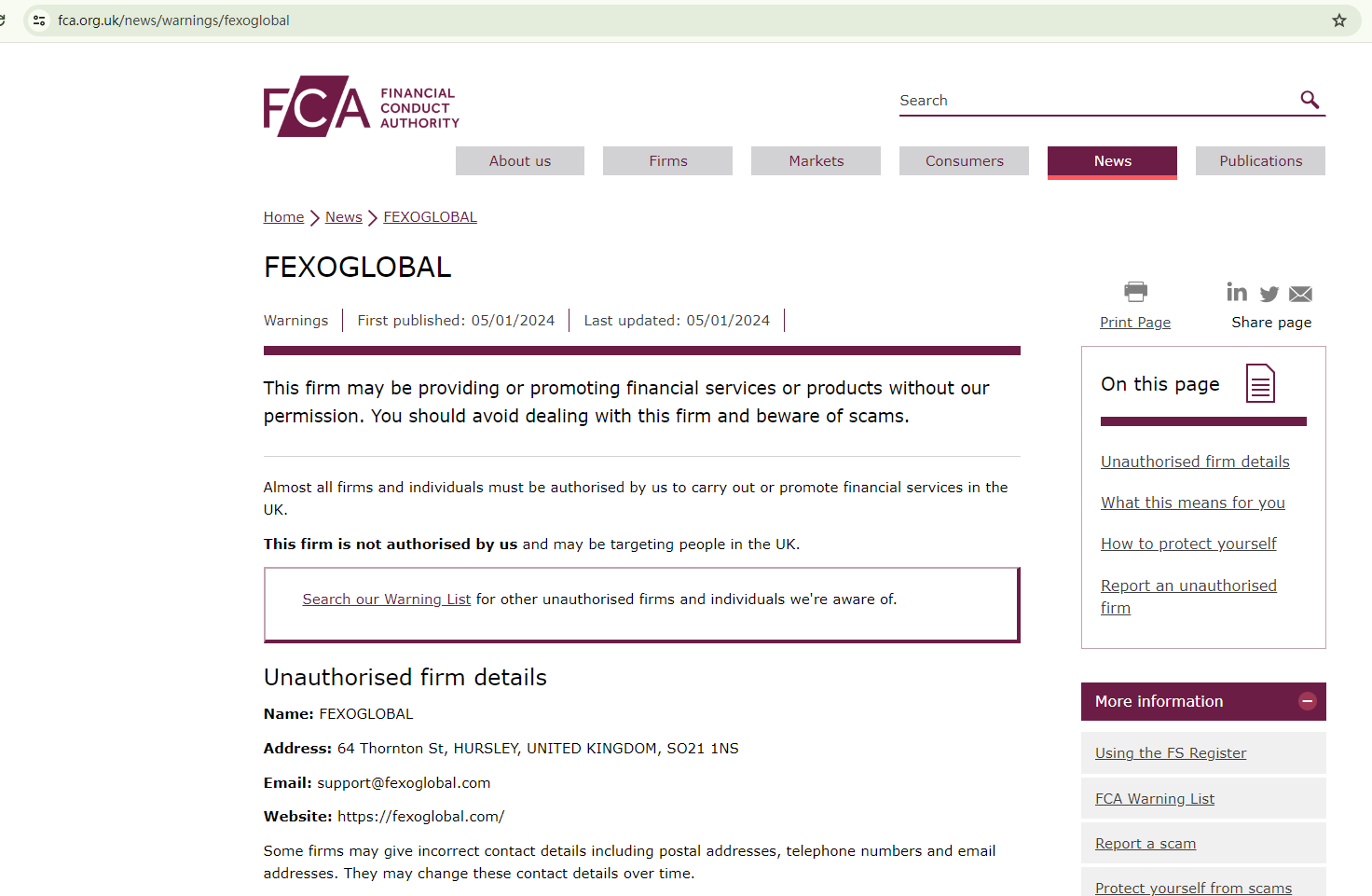 On January 5, 2024, the Financial Conduct Authority (FCA) issued a warning against Fexoglobal, believing this company might be providing financial services or products without proper authorization in the UK. https://www.fca.org.uk/news/warnings/fexoglobal