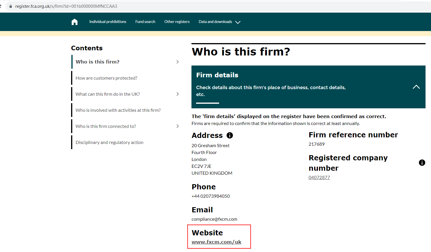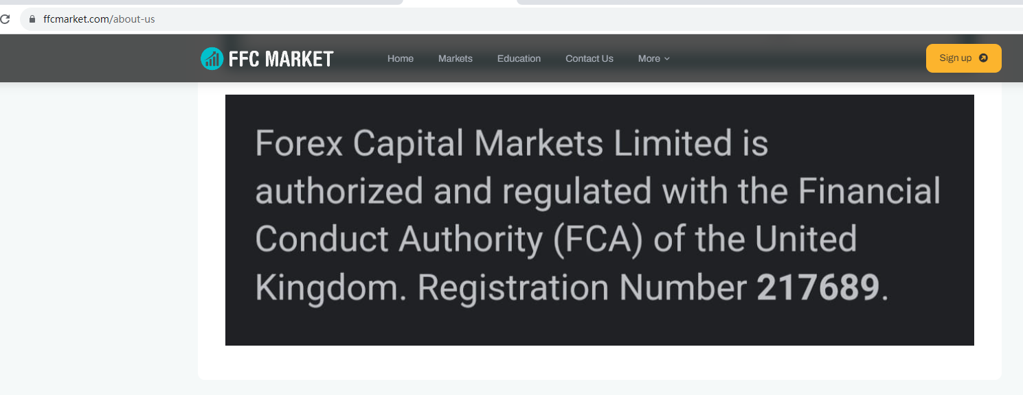 FFC MARKET also claims to be operated by Forex Capital Markets Limited, which is regulated by the Financial Conduct Authority (FCA), registration number: 217689. We searched the FCA but found the company operates another broker https://www.fxcm.com/uk/, which has nothing to do with FFC MARKET. It is a red flag.