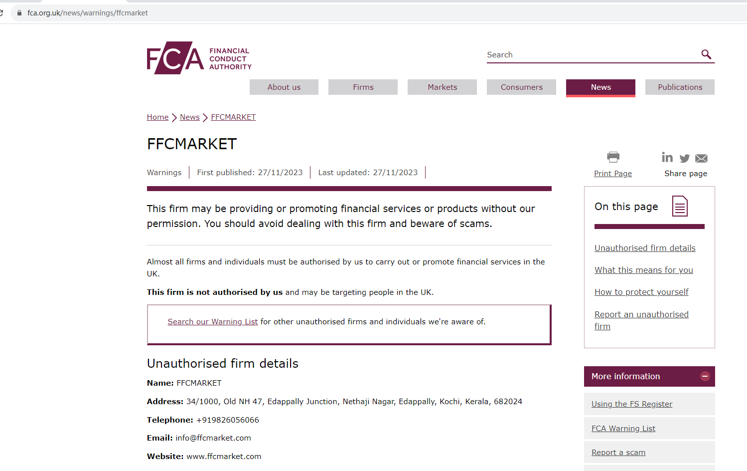 On 27 November 2023, the United Kingdom Financial Conduct Authority (UK FCA) issued a warning that FFC MARKET was providing financial services or products in the UK without authorisation. You may visit: https://www.fca.org.uk/news/warnings/ffcmarket