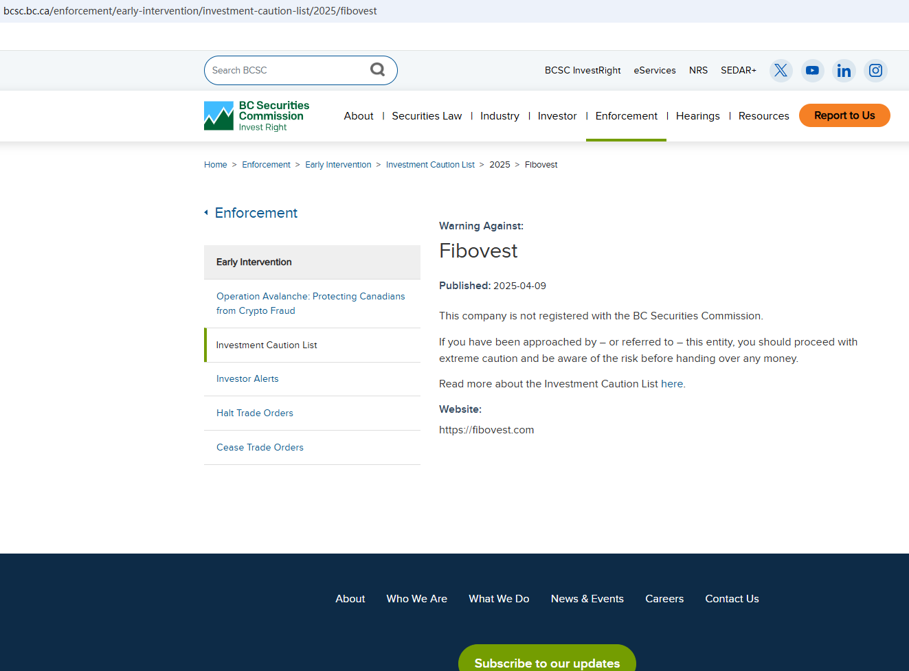 On April 9, 2025, the British Columbia Securities Commission (BCSC) issued a warning that Fibovest was providing financial services or products without authorisation. You may visit: https://www.bcsc.bc.ca/enforcement/early-intervention/investment-caution-list/2025/fibovest