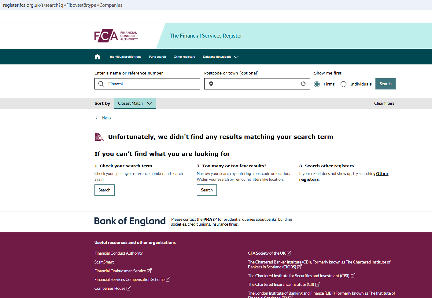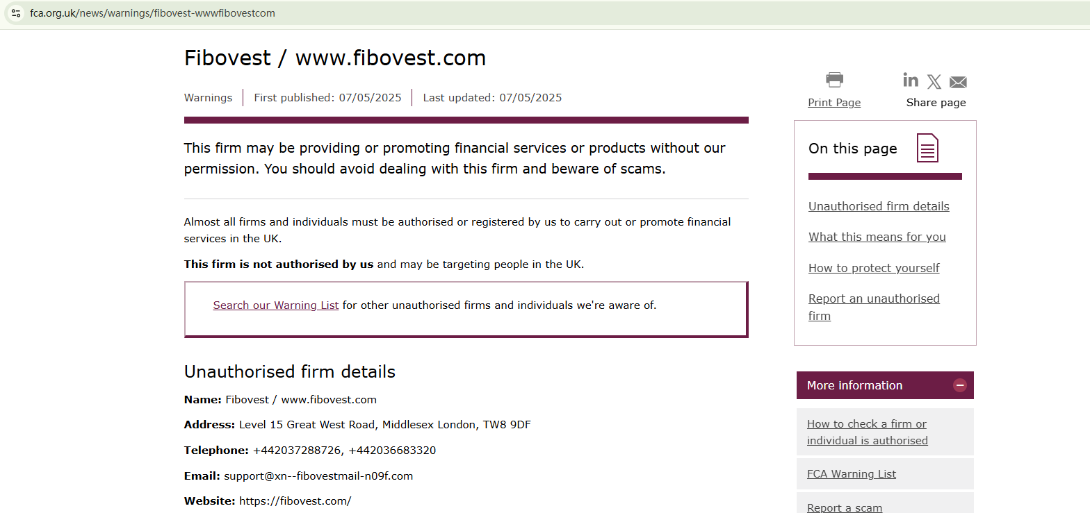On May 7, 2025, the Financial Conduct Authority (FCA) issued a warning against Fibovest, believing this company might be providing financial services or products without proper authorization in the UK. https://www.fca.org.uk/news/warnings/fibovest-wwwfibovestcom