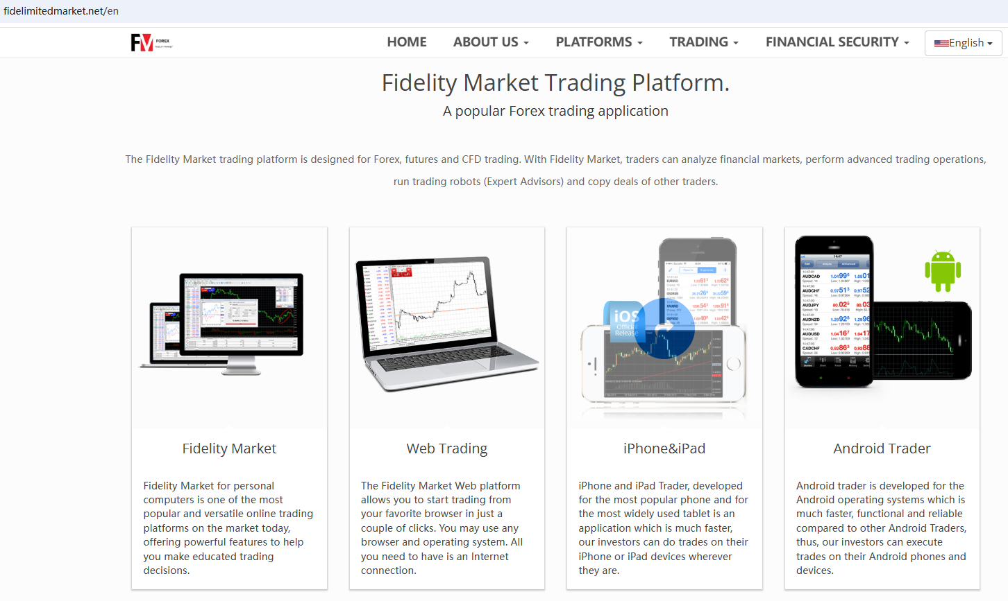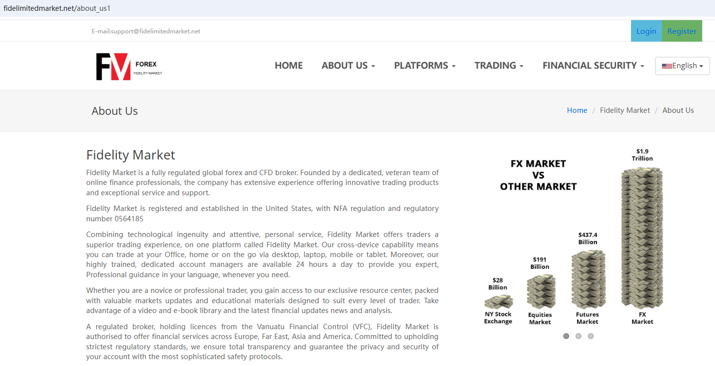 Fidelity Market claims to be regulated by the U.S. National Futures Association (NFA) and the Vanuatu Financial Control(VFC) with license number 0564185, is a fully regulated global broker registered and established in the United States, offering a range of investment products to traders, including Forex, futures and CFD for trading in global markets.