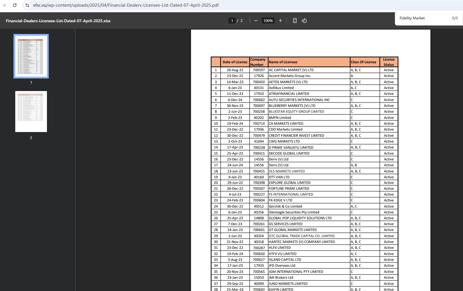 Upon investigation, we found that Fidelity Market is not regulated by the NFA and the Vanuatu Financial Services Commission(VFSC).