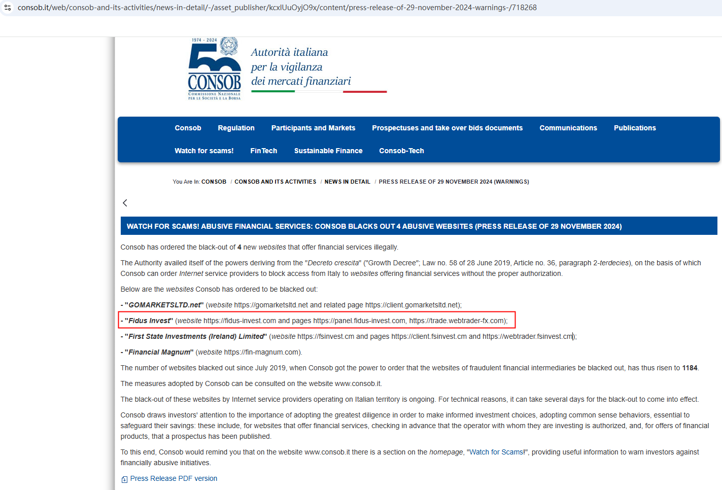 In addition, the Italian Companies and Exchange Commission (CONSOB) ordered Fidus Invest to be blacked out since it offers financial services illegally in Italy.