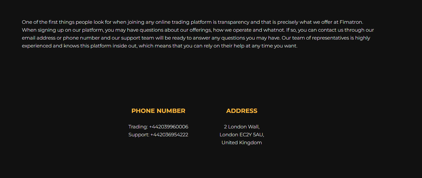 Fimatron does not disclose any regulatory information, offering only a registered address and phone number in the United Kingdom. Our investigation with the Financial Conduct Authority (FCA) has found no record of this entity, confirming that Fimatron is not authorized by the FCA to conduct financial trading activities in the UK. Operating in this manner constitutes unauthorized and illegal activity under UK financial regulations.