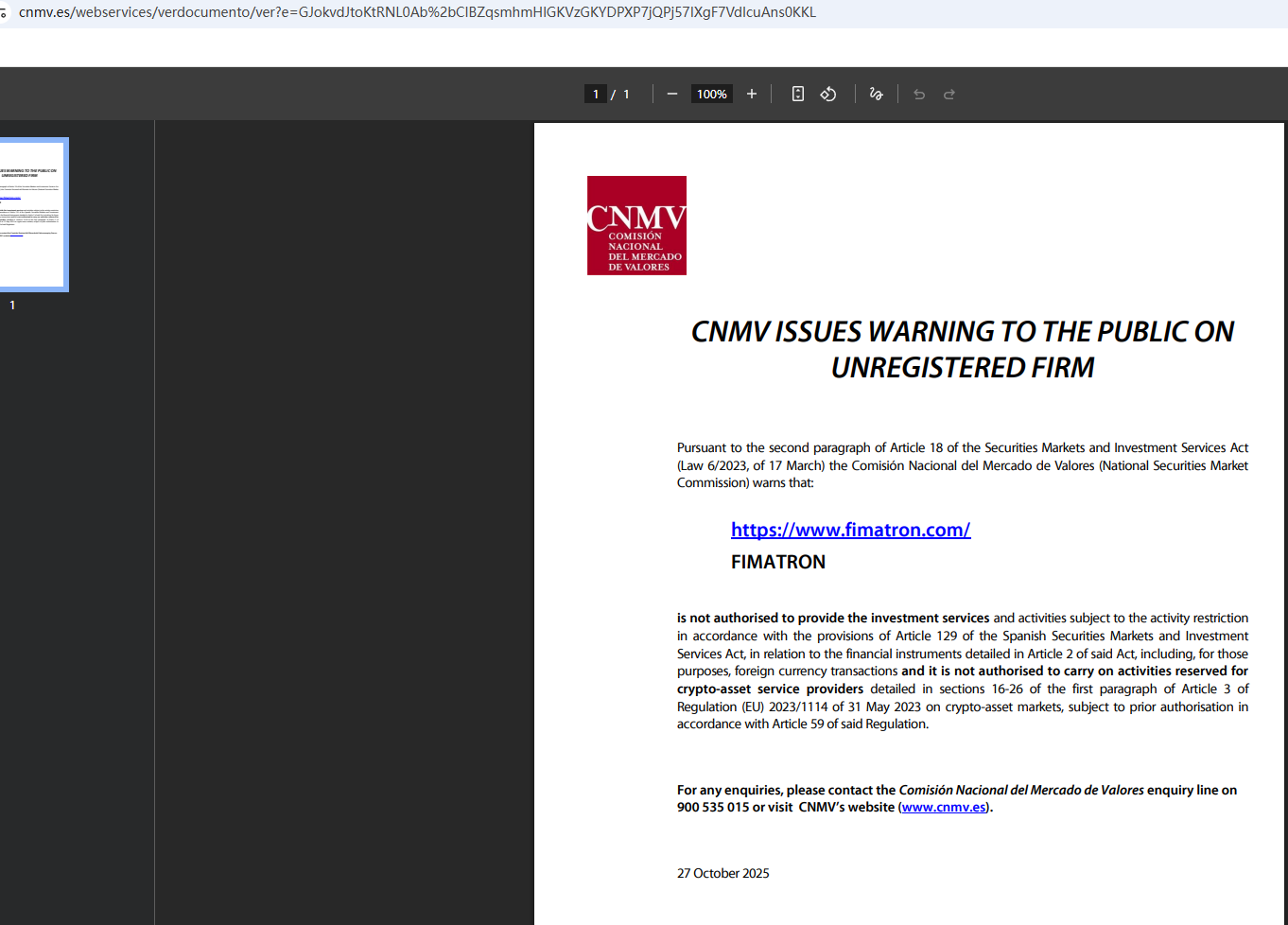 On Oct 27, 2025, the National Securities Market Commission (CNMV) issued a warning against Fimatron, believing this company might be providing financial services or products without proper authorization. https://www.cnmv.es/webservices/verdocumento/ver?e=GJokvdJtoKtRNL0Ab%2bCIBZqsmhmHlGKVzGKYDPXP7jQPj57IXgF7VdIcuAns0KKL