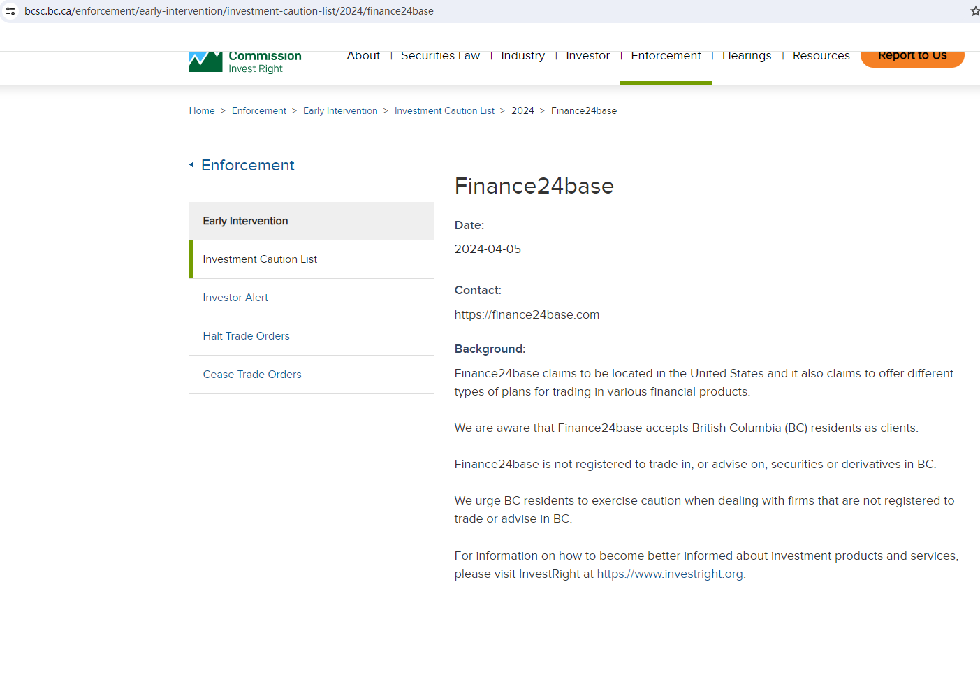 On 5 Apr 2024, the British Columbia Securities Commission (BCSC) issued a warning that Finance24base was providing financial services or products without authorisation. You may visit: https://www.bcsc.bc.ca/enforcement/early-intervention/investment-caution-list/2024/finance24base