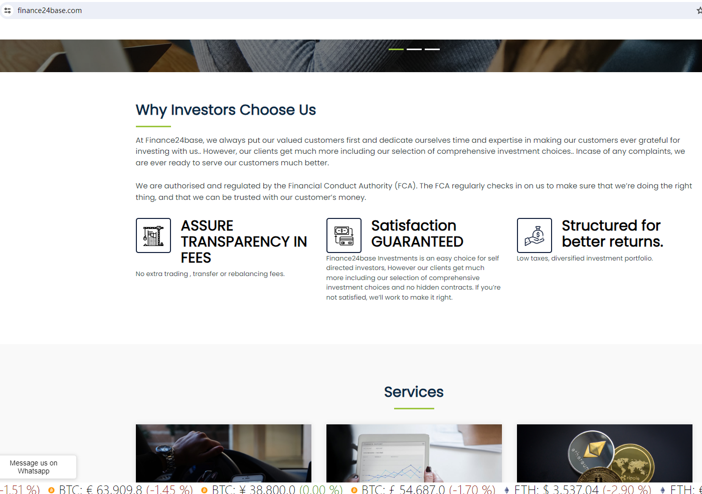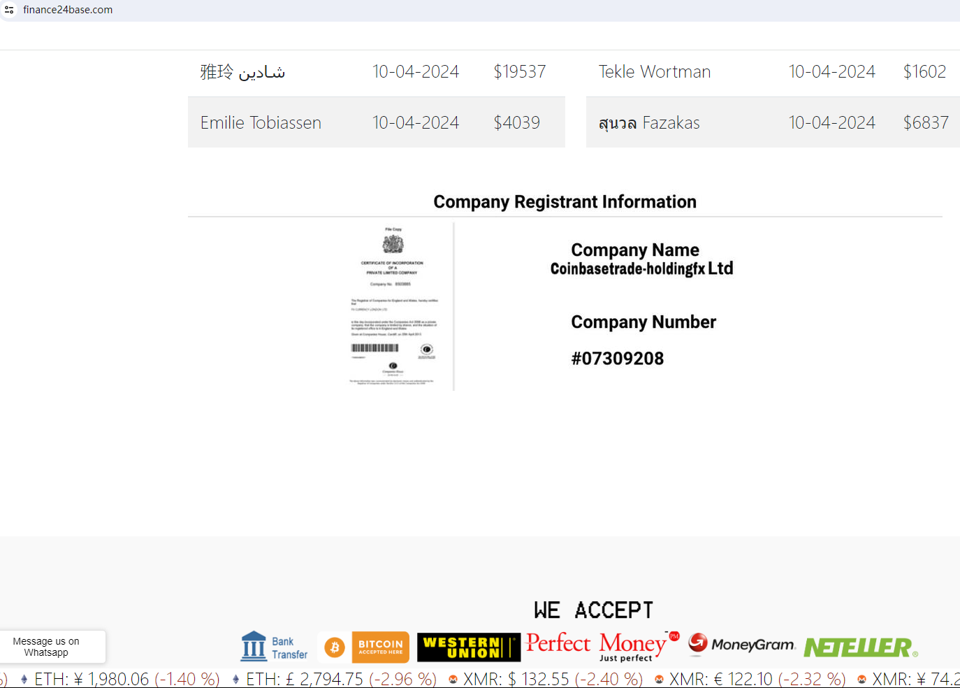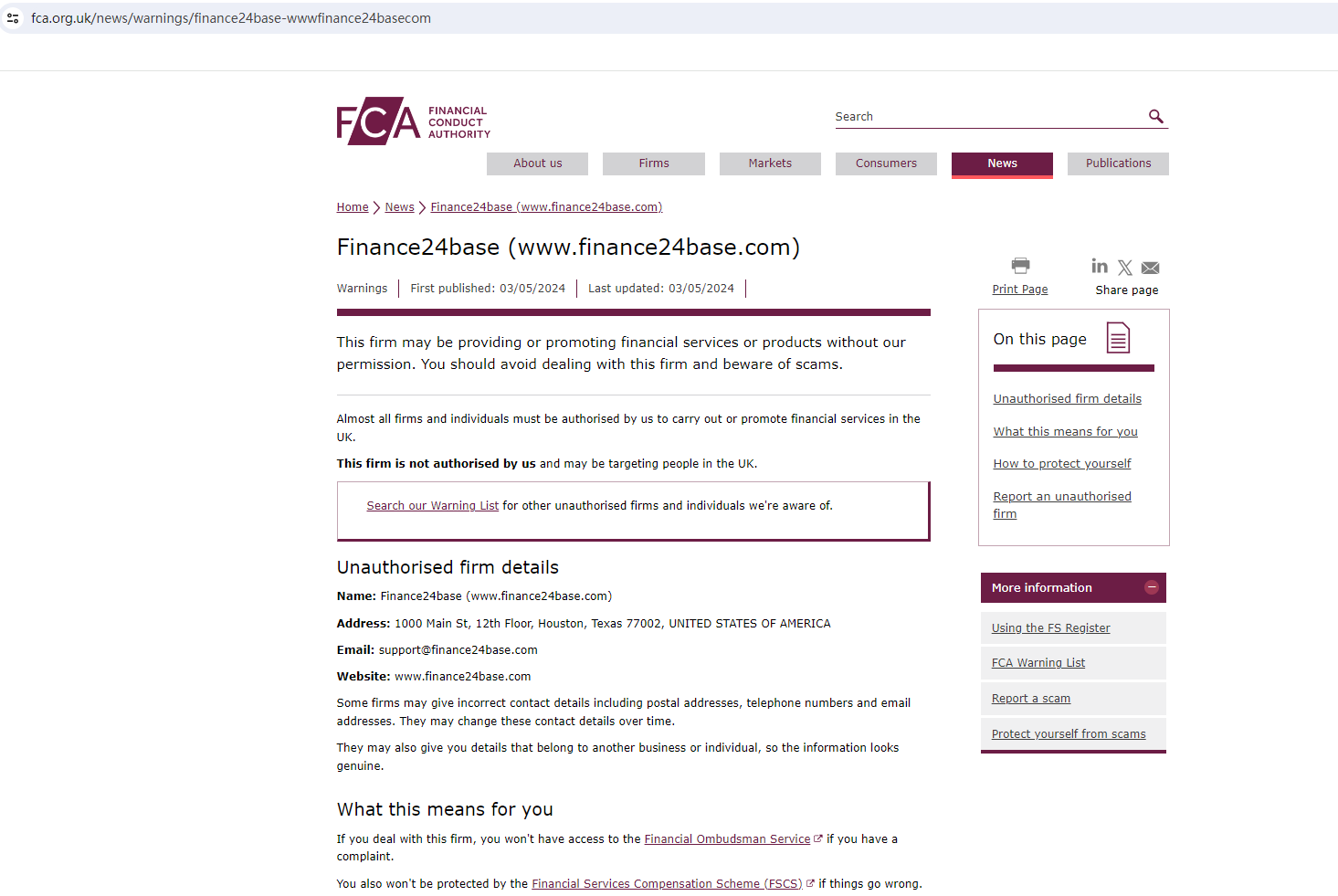 On May 3rd, 2024, the Financial Conduct Authority (FCA) issued a warning against Finance24base, believing this company might be providing financial services or products without proper authorization in the UK. https://www.fca.org.uk/news/warnings/finance24base-wwwfinance24basecom