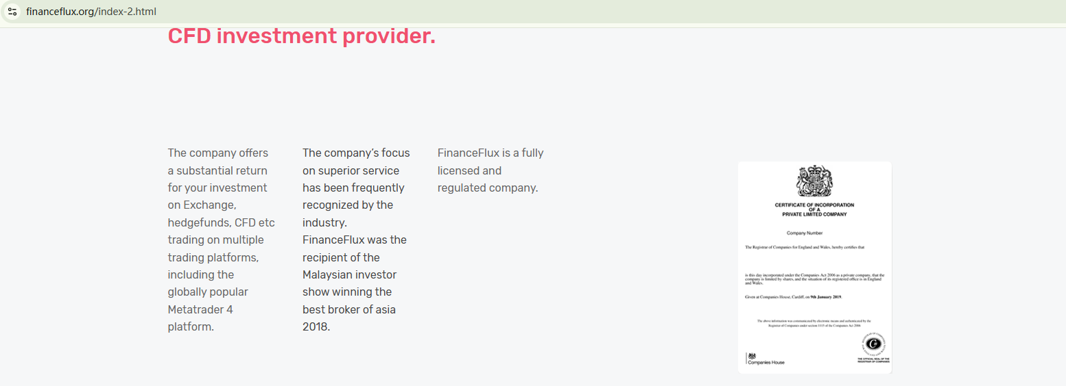 FinanceFlux claims to be regulated in the UK for several years, merely relying on a suspicious certificate allegedly from the Companies House (CH) to support that claim. This raises serious concerns about the broker's authenticity and credibility. The Financial Conduct Authority (FCA) has issued a warning against FinanceFlux, noting that FinanceFlux is unauthorized and advising investors to stay clear.