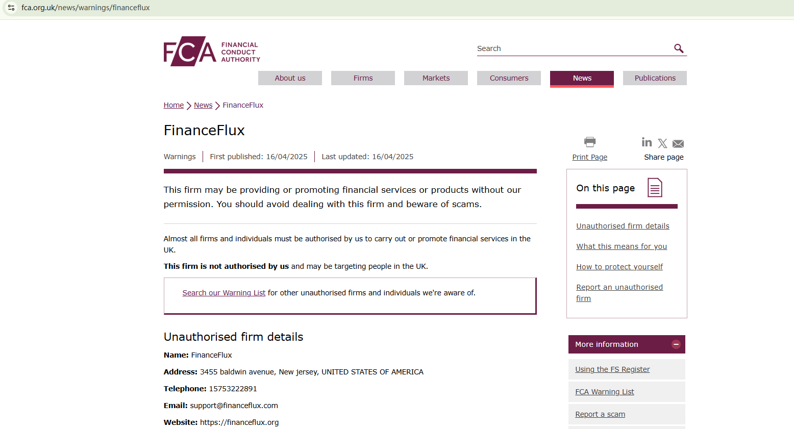On April 16, 2025, the Financial Conduct Authority (FCA) issued a warning against FinanceFlux, believing this company might be providing financial services or products without proper authorization in the UK. https://www.fca.org.uk/news/warnings/financeflux
