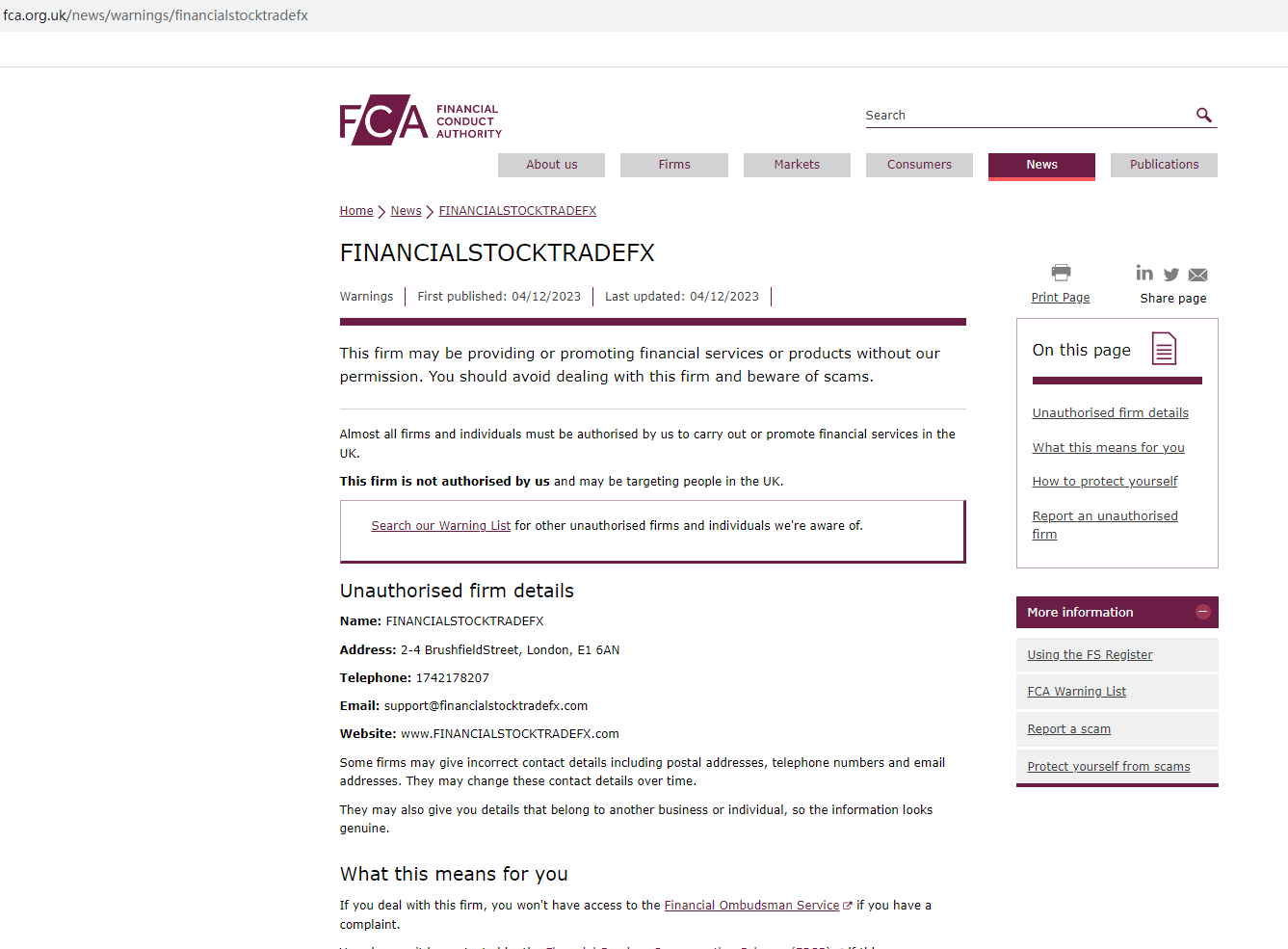 On 4 Decmber, 2023, the Financial Conduct Authority (FCA) issued a warning against FINANCIALSTOCKTRADEFX, believing this broker might be providing financial services or products without proper authorization. https://www.fca.org.uk/news/warnings/financialstocktradefx