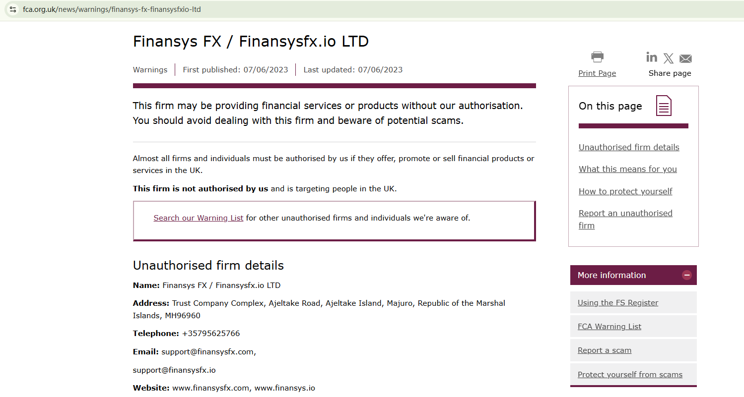 On June 7, 2023, the Financial Conduct Authority (FCA) issued a warning against Finansys FX for the lack of the required authorization. https://www.fca.org.uk/news/warnings/finansys-fx-finansysfxio-ltd