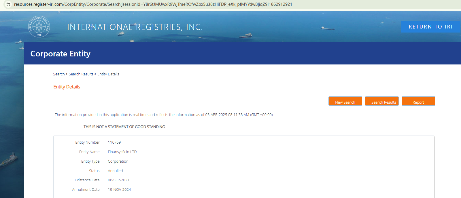 The website of Finansys FX is currently down, a significant red flag. The claimed registration with the Marshall Islands Registry (IRI) was canceled as early as 2024, which cannot constitute a valid license from a financial regulator. In addition, the Financial Conduct Authority (FCA) has issued a warning about Finansys FX, advising investors to stay away from this unauthorized financial firm.