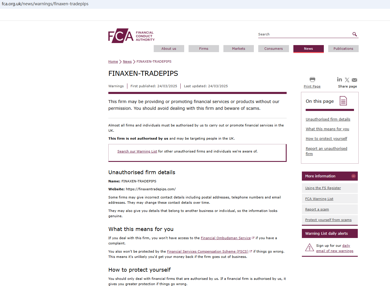 On March 24, 2025, the Financial Conduct Authority (FCA) issued a warning against FINAXEN TRADEPIPS for the lack of the required authorization. https://www.fca.org.uk/news/warnings/finaxen-tradepips